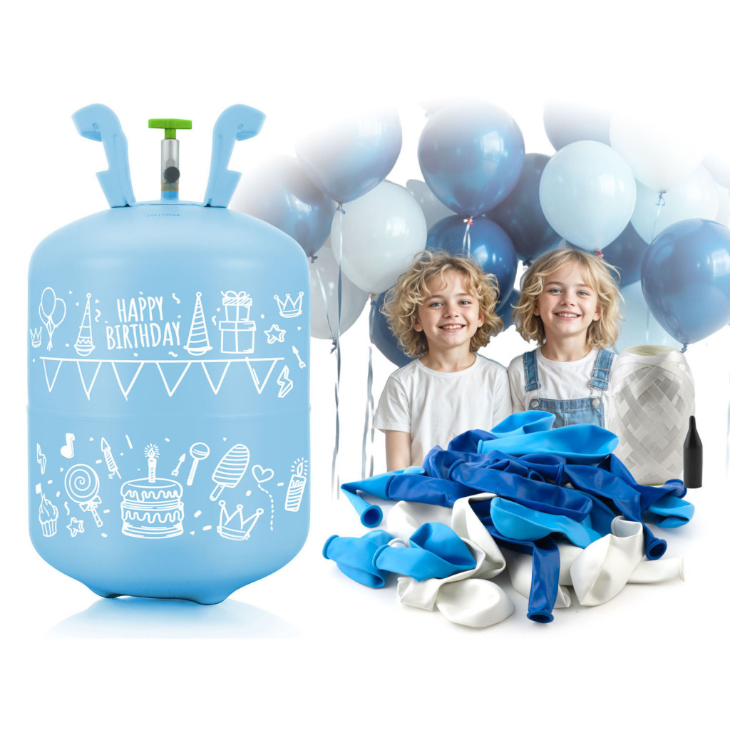 Hélium palack 0,20m3 + 30 db fehér, kék és sötétkék léggömbök + 40m szalag