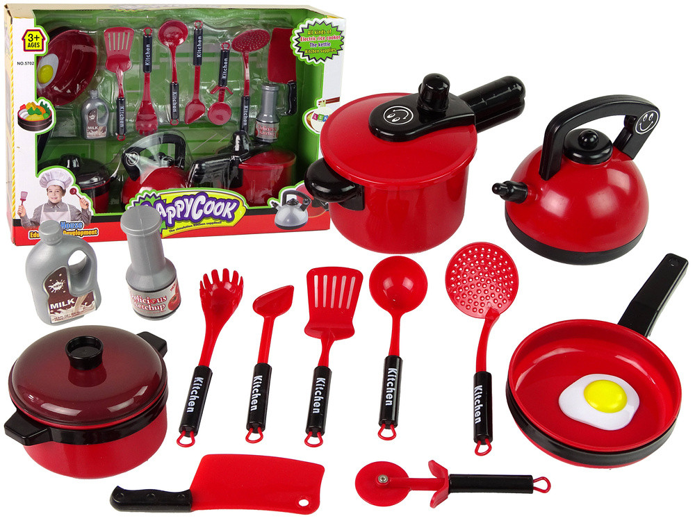 Piros konyhai eszközökből álló edénykészlet A házikózás az egyik legnépszerűbb időtöltés a gyerekek körében. Lehetővé teszi különféle, eredeti jelenetek létrehozását, gyermeke imád a konyhában sürögni-forogni és ételt készíteni, a készletünkben található kiegészítők pedig lehetővé teszik egyedi ételek elkészítését. A kisgyermek játék közben fejleszti kreativitását és kézügyességét. Talán a főzés iránti érdeklődése is kialakul. A készlet műanyag, piros edényeket tartalmaz, amelyek tökéletesen utánozzák az igazi edényeket. Az edényekkel együtt olyan konyhai kiegészítők is találhatók, mint: kiöntő, kés, tésztakanál és még sok más. A készlet kiváló minőségű műanyagból készült, így 3 év feletti gyermekek számára biztonságos. A készlet tartalma: - vízforraló: 15 cm x 12 cm x 15 cm - serpenyő füllel: 22 cm x 13 cm x 3 cm - fazék fedővel: 17 cm x 13 cm x 9 cm - lábas füllel és fedővel: 23 cm x 14 cm x 14 cm - konyhai eszközök (kanalak stb.) - cumisüvegek (tej és ketchup) - műanyag tükörtojás   A csomag mérete: 51cm x 34cm x 16cm   CE tanúsítvánnyal rendelkezik és megfelel az EN71 szabványnak. A játék 3 év feletti gyermekek számára készült.