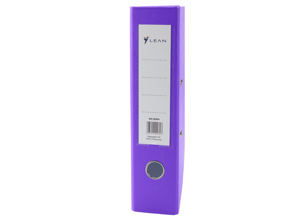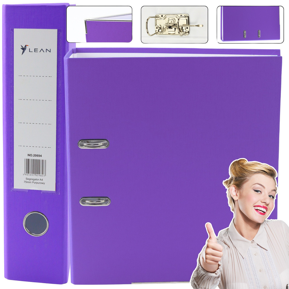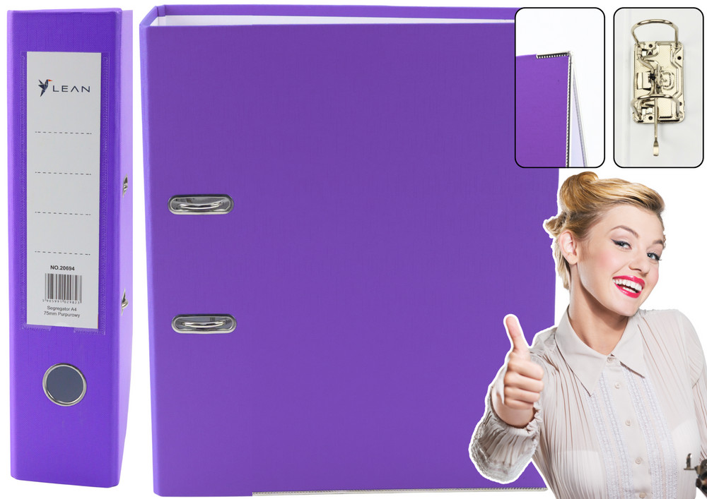 A4/75 mm-es irattartó gyűrűs mechanizmussal Lila A4-es irattartó gyűrűs mechanizmus széles, 75 mm-es gerinccel, elegáns, élénk lila színben. Ideális dokumentumok tárolására irodában, otthon és iskolai anyagok rendszerezésére. Ez a tágas mappa akár 500 lapot is képes befogadni (80 g/m² súlyú), így kiváló megoldás számlák, szerződések, jelentések és egyéb fontos dokumentumok archiválására. A kiváló minőségű konstrukció biztosítja a mappa megbízhatóságát és tartósságát. Termékelőnyök Tartós anyag: A mappa 2 mm vastagságú és 1200 g/m² grammsúlyú, strapabíró kartonból készült, így nagy ellenállást biztosít a mindennapi használattal szemben. Masszív konstrukció: A megerősítő alsó csík tovább növeli a mappa tartósságát, így hosszú ideig szolgálhat látható kopásjelek nélkül. Nikkelezett emelőkaros mechanizmus: A kiváló minőségű emelőkaros mechanizmus lehetővé teszi a lapok sima behelyezését és eltávolítását, a fém szerelvények pedig korrózióállóak. Praktikus méretek: A mappa mérete 75x320x285 mm, tökéletesen illeszkedik a szabványos polcokra, könyvespolcokra és irodai szekrényekre, lehetővé téve a dokumentumok egyszerű rendszerezését bármilyen térben. Biztonság és ökológia: A CE tanúsítvány igazolja az európai minőségi és biztonsági szabványoknak való megfelelést. A mappa környezetbarát anyagokból készült és újrahasznosítható. Specifikáció Formátum: A4 Gerinc szélessége: 75 mm Szín: Lila Anyag: 2 mm vastagságú és 1200 g/m2 grammsúlyú karton Kapacitás: Akár 500 lap (80 g/m²) Mechanizmus: Nikkelezett emelőkaros mechanizmus Méretek: 75x320x285 mm Tanúsítvány: CE Ideális választás irodai dokumentumok archiválására, dokumentumok otthoni tárolására, iskolai és irodai anyagok rendszerezésére, intenzív használatra az irodában. Az A4-es mappa nélkülözhetetlen kiegészítő, amely segít könnyedén és gyorsan rendszerezni és rendszerezni minden fontos dokumentumát és iratát. Masszív mechanizmusával és modern lila dizájnjával ez a mappa karaktert kölcsönöz bármely irodának vagy otthonnak.