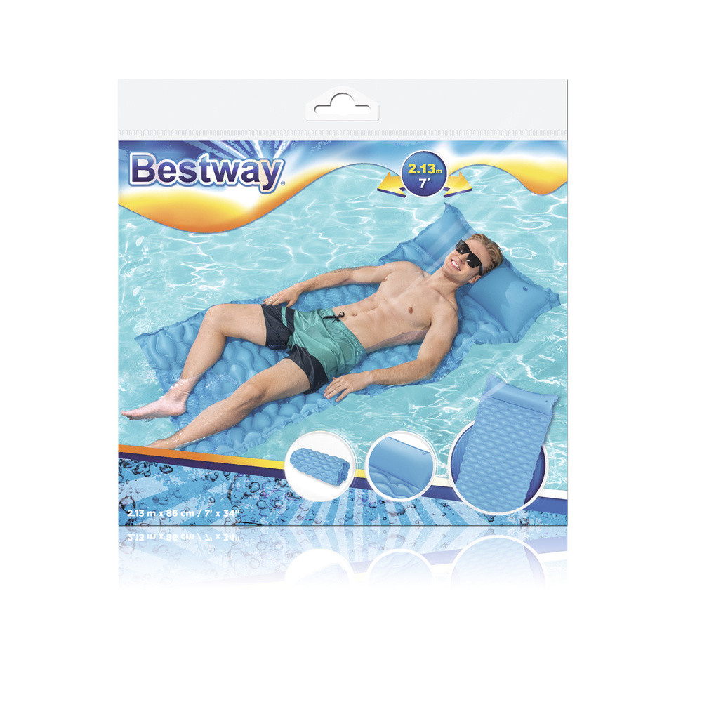 Felfújható matrac 213 x 86 cm Bestway 44020Az egyik legnépszerűbb úszási kellék, amire minden vízimádónak szüksége van, a matrac. Ennek köszönhetően a vízben fürödve is élvezheti a napsütést. A matrac beépített felfújható párnával van felszerelve, ami növeli a használat kényelmét. Emellett nagyon stabil a vízen. Sérülésálló PVC anyagból készült, így bármikor élvezheti a használatát.Műszaki adatok:- méretek 213 x 86 cm- beépített párna- javítófolt mellékelve- PVC anyag- könnyen feltekerhető- maximális terhelhetőség 90 kgSúly: 1,2 kgA csomag mérete: 28 cm x 24 cm x 26 cm