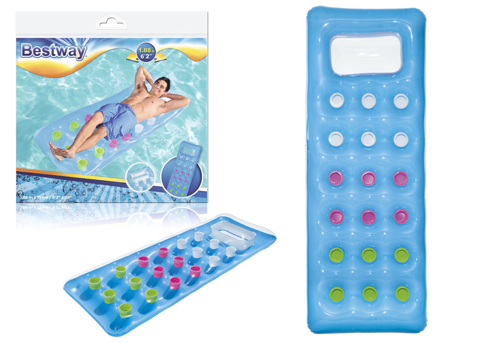 Légmatrac Kék188 x 71 cm Bestway 43040A matrac a vízparti kirándulások legnépszerűbb kiegészítője. Szerezzen be egy olyan matracot, amely tökéletesen megfelel az elvárásainak, és segít ellazulni a szabadidőben. A matrac nagyon kényelmes, és vázszerkezetének köszönhetően megfelelően illeszkedik a testéhez. A lyukak akár italtartóként is használhatók. Tartós PVC anyagból készült, amely ellenáll a sérüléseknek, így nem kell aggódnia, hogy valami elrontja a pihenését.Műszaki adatok:- méretek 188 cm x 71 cm- PVC anyag- maximális terhelhetőség akár 90 kg-ig- érdekes színek- PVC anyag vastagsága 0,24 mm- Ablakpárna- javítófolt mellékelveSúly: 1 kgCsomag mérete: 30 x 27 x 5 cm