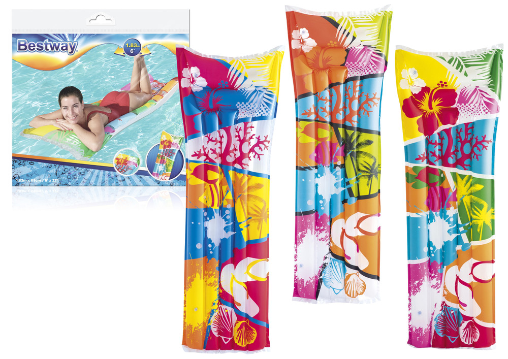 Felfújható matrac úszáshoz 183 x 69 cm Bestway 44033 Az egyik legnépszerűbb úszáskellék, amire minden vízimádónak szüksége van, a matrac. Ennek köszönhetően a vízben feküdhetsz anélkül, hogy elhagynád a vizet. A matrac beépített felfújható párnával van felszerelve, ami növeli a használat kényelmét. Emellett nagyon stabil a vízen. Sérülésálló PVC anyagból készült, így bármikor élvezheted a használatát. Műszaki adatok: - méretek 183 x 76 cm - beépített párna - javítófolt mellékelve - PVC anyag - maximális terhelhetőség 90 kg A matrac három színmintában kapható. A szín véletlenszerűen kerül kiválasztásra. Súly: 0,8 kg