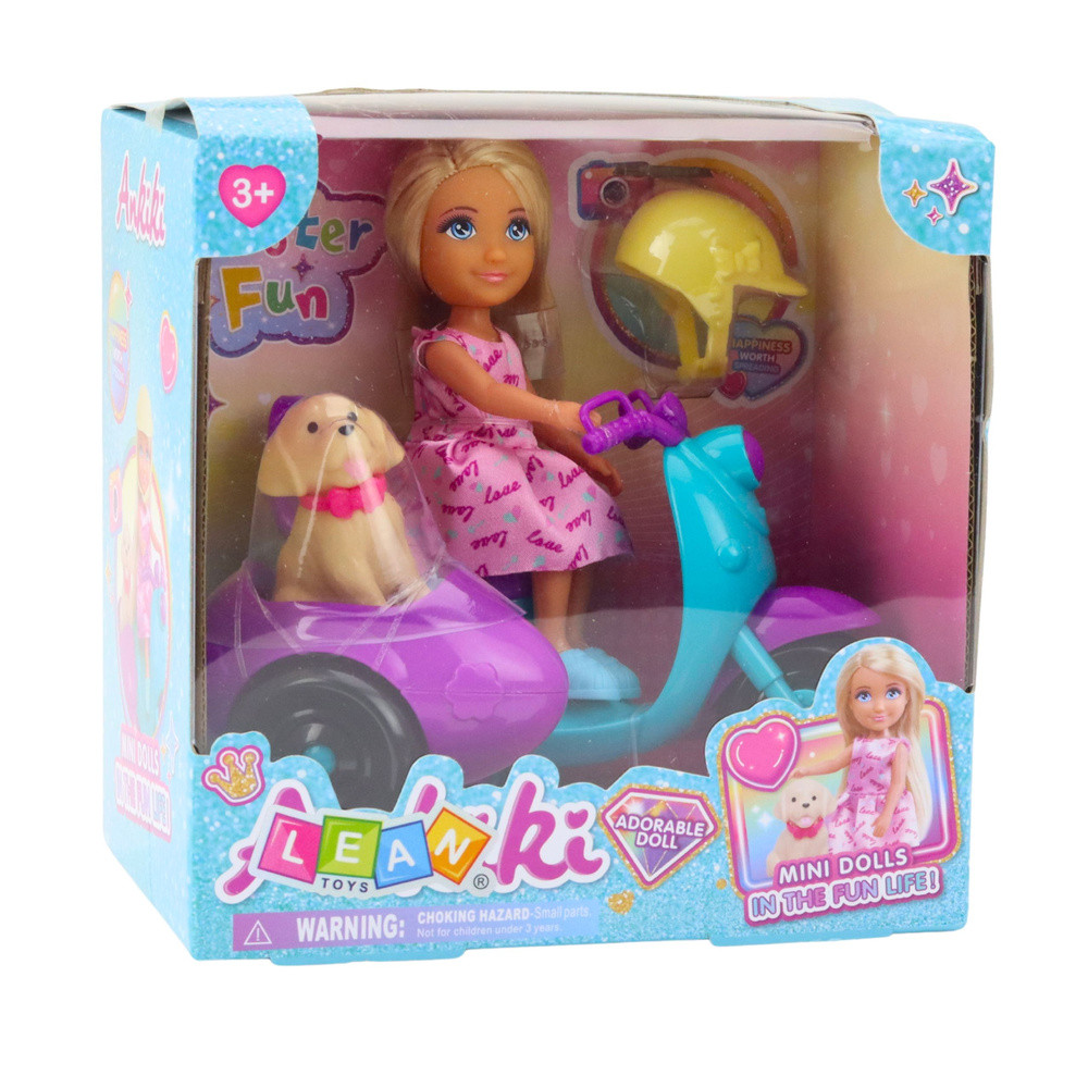 ANKIKI BABA ROBOGÓN KUTYÁVAL Az Ankiki baba rolleren kutyával egy bájos készlet, amely minden utazást, kalandot és háziállatok gondozását kedvelő gyermeket elragadtat. A főszereplő – az Ankiki baba – 13 cm magas, rózsaszín mintás ruhát és kék cipőt visel. Egy sárga védősisak teszi teljessé a megjelenését, egy csipetnyi realizmust adva a készletnek és kiemelve a biztonságot. A baba egy háromkerekű rolleren közlekedik, amelyet élénk kék és lila színek díszítenek. A roller oldalán egy utánfutó található, amelyben egy piros nyakörvvel ellátott kiskutya található – hűséges társ minden úton. A készlet tartós, biztonságos anyagból készült, tökéletes a mindennapi játékhoz. Ez a készlet fejleszti a képzeletet, megtanítja a háziállatok gondozását, és a játékos utazáson keresztül elősegíti a kreativitást. MŰSZAKI ADATOK: Baba magassága: 13 cm Csomag méretei: 16,5 x 16,5 x 11 cm Anyag: műanyag, szövet Kialakítás: rózsaszín ruha, kék cipő, sárga sisak Jármű: háromkerekű roller utánfutóval Háziállat: kutyafigura nyakörvvel Mozgatható részek: fej, karok, lábak Cél: utazási játék, háziállatgondozás, szerepjáték SZETT TARTALMA: Ankiki baba Roller utánfutóval Kutyasisak