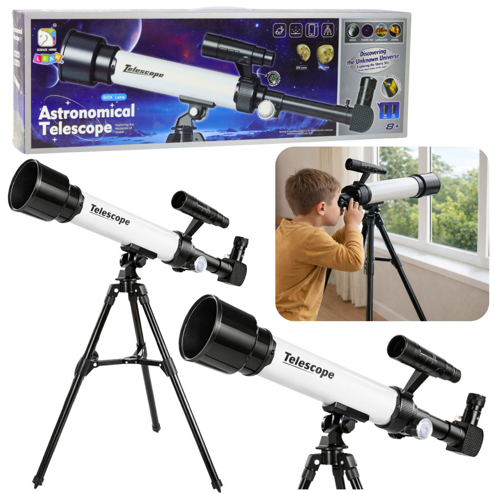 CSILLAGÁSZATI TÁVCSŐ GYERMEKEKNEK TELEFONTARTÓVALEz a csillagászati ​​távcső tökéletes választás a világ iránt kíváncsi és az űr iránt lenyűgözött gyerekek számára. Egyszerű kezelésének és valós nagyításának köszönhetően lehetővé teszi a Hold, a csillagok, valamint a madarak vagy távoli objektumok megfigyelését a terepen. A berendezést a fiatal felfedezők szem előtt tartásával tervezték, tökéletes egyensúlyt kínálva a szórakozás és a tanulás között. A készlet két cserélhető okulárt (30x és 60x), egy távcsövet a tárgyak pontosabb célzásához, egy stabil állványt és egy iránytűt tartalmaz a terepen való könnyebb tájékozódáshoz. További előny az okostelefon-tartó, amely lehetővé teszi a megfigyelések közvetlen elvégzését a telefon képernyőjén, valamint fényképek és felvételek készítését. Ez egy nagyszerű ajándékötlet egy fiatal csillagászati ​​rajongó számára. Minden elem gondosan becsomagolt egy színes, esztétikus dobozba, így a készlet azonnal elajándékozható. SPECIFIKÁCIÓ: Nagyítás: 30x és 60x (két okulár) Megfigyelés típusa: felülről vagy távcsövön keresztül Telefontartó: IGEN Forgatható tartó és fókuszállítás: IGEN Állvány: stabil, teleszkópos Anyag: műanyag + fém elemek Csomag méretei: 70 x 23 x 10,5 cm A KÉSZLET TARTALMA: Távcső 2 okulár (30x és 60x) Távcső Okostelefontartó Stabil állvány Kendő Használati útmutató