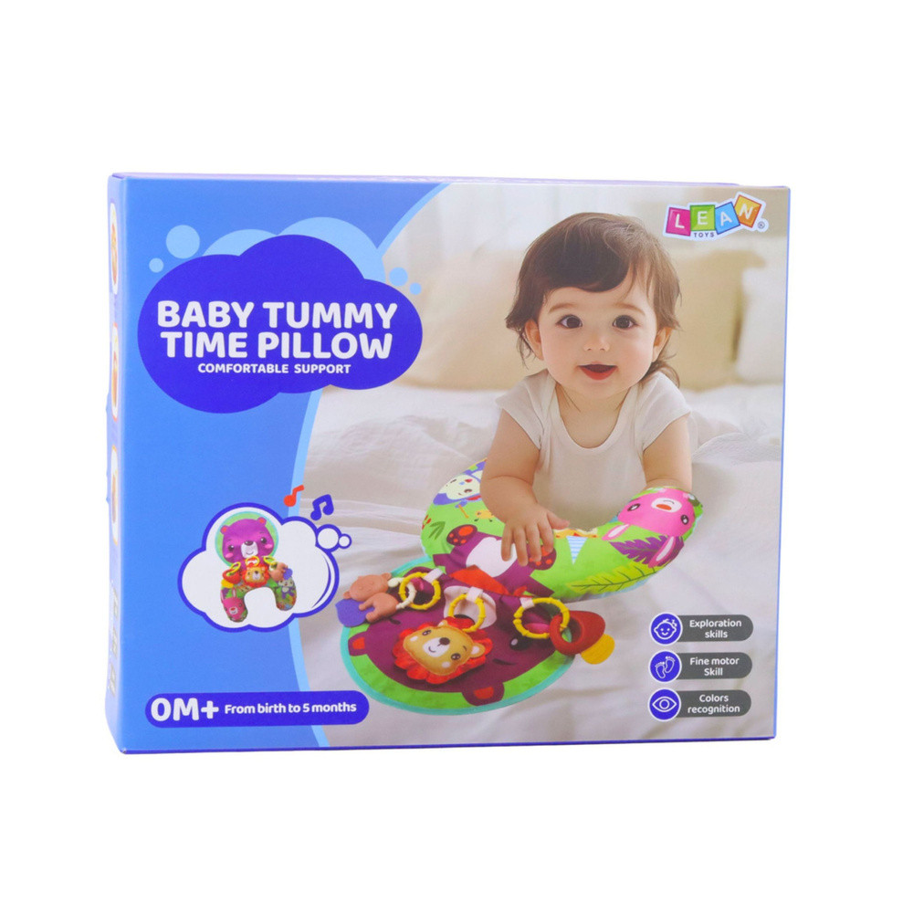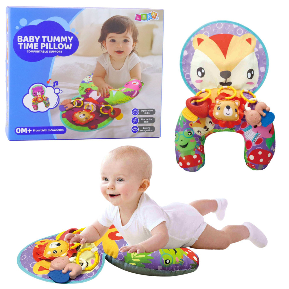 BABATÁMASZTÓ PÁRNA AKADÓKKALA babatámasztó párna a legkisebb gyermekek számára készült, és már az első napoktól támogatja fejlődésüket. Speciálisan kialakított formájának köszönhetően a párna megkönnyíti a hason fekvést, erősíti a nyak-, váll- és hátizmokat, felkészítve a gyermeket a későbbi fejlődési mérföldkövekre, például a felülésre és a mászásra. Nemcsak kényelmes, hanem mindenekelőtt egy olyan eszköz, amely támogatja a kisgyermek megfelelő fejlődését. A párna színes, puha és kellemes tapintású, játékra és felfedezésre ösztönöz. A készlet három különböző formájú és színű akasztót tartalmaz, amelyek felerősíthetők a kíváncsiság felkeltésére és a finommotoros készségek fejlesztésére. Ezenkívül a susogó anyagból készült rókaszőnyeg hallási stimulációt biztosít, megtanítva a gyermeket az ok-okozati összefüggésekre – a nyomás és az érintés hangokat produkál, ami örömet okoz és további aktivitásra ösztönöz. Ez a praktikus megoldás ötvözi a játék, az aktivitásszőnyeg és a kényelmes tornatámasz funkcióit. Ez a medálokkal ellátott támasztópárna tökéletes ajándék lesz egy babának, támogatva fejlődését és órákig tartó szórakozást nyújtva. SPECIFIKÁCIÓK: Típus: Támasztópárna babánakMinta: RókaTovábbi jellemzők: Susogó anyag rókamintás szőnyegbenMedálok: 3 darab, különböző formájú és színűAnyag: Puha, színes, kiváló minőségű szövetPárna méretei: kb. 48 x 34 cmCsomag méretei: 30,5 x 26 x 9 cmSzínek: Többszínű, kontrasztos, érzékszerveket stimulálóA KÉSZLET TARTALMA:Támasztópárna babának3 színes medálSzínes ajándékdoboz