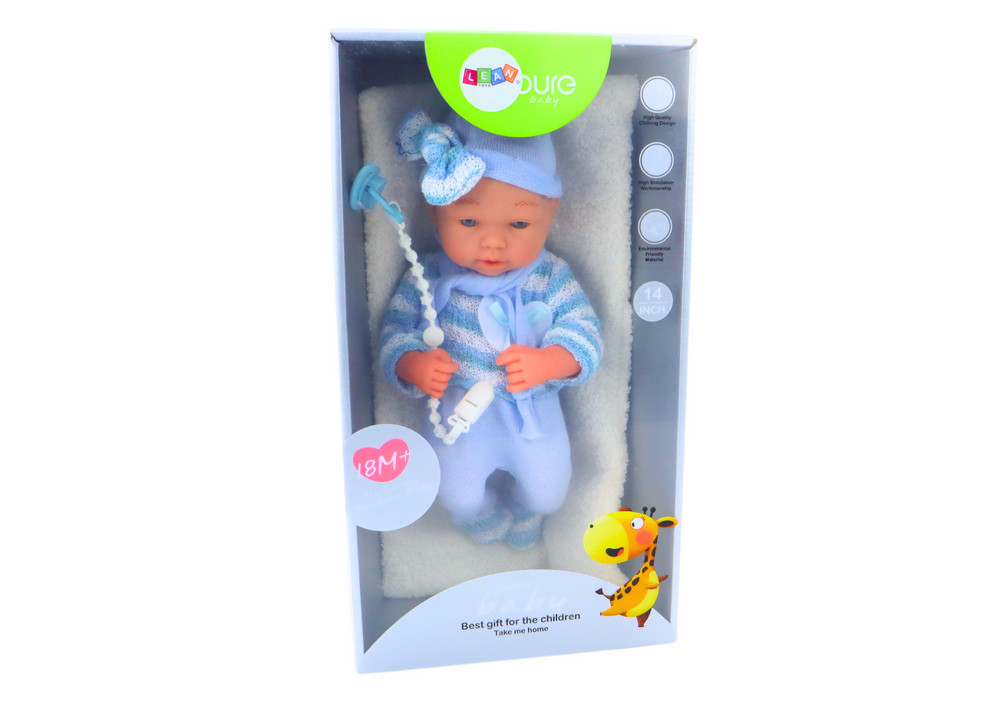 Baba, csíkos pulóver, sapka, kék sál Egy kék ruhás baba tökéletes társ minden kis gondozó számára. Bájos kék-fehér csíkos pulóvere, sapkája és sálja igazán elbűvölővé teszi. Mozgatható karjai és lábai könnyen mozgathatók és különböző pozíciókba állíthatók, ami realizmust és interakciós lehetőséget ad a játék során. Ez az imádnivaló baba biztonságos és tartós anyagokból készült, biztosítva a gyermekek számára a biztonságos játékot. Realisztikus vonásai, beleértve a finom arckifejezéseket, igazi babává teszik, ami fokozza a báját, és arra ösztönzi a gyerekeket, hogy részt vegyenek a gondozásában. A babával való játék empátiát és felelősségtudatot fejleszt a gyermekekben, arra ösztönzi őket, hogy úgy gondoskodjanak róla, mint egy igazi babáról. Ennek köszönhetően a kicsik különböző gondozási forgatókönyveket játszhatnak el, és megtanulhatják, hogyan kell gondoskodni és etetni egy babát, ami serkenti a képzelőerejüket és a szociális fejlődésüket. Ez a kék ruhás baba nemcsak szórakozást nyújt, hanem fejleszti a gyermekek gondoskodási és érzelmi készségeit is, ideális társ a kellemes és kreatív játékhoz. A baba méretei: 36cm x 17cm x 9cm A csomag mérete: 43cm x 24cm x 14,5cm CE tanúsítvánnyal rendelkezik és megfelel az EN71 szabványnak. 18 hónapos kortól gyermekek számára készült.