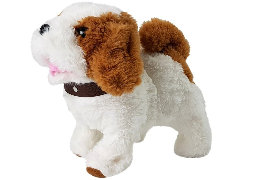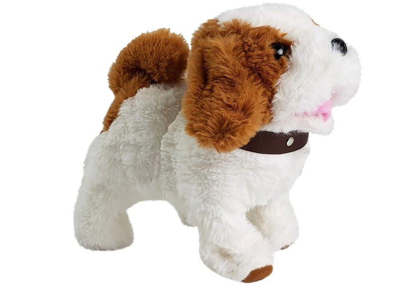 Elemmel működő plüss kutya fehér, barna foltos kiegészítőkkel, hanggal