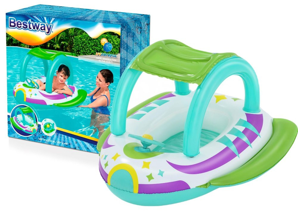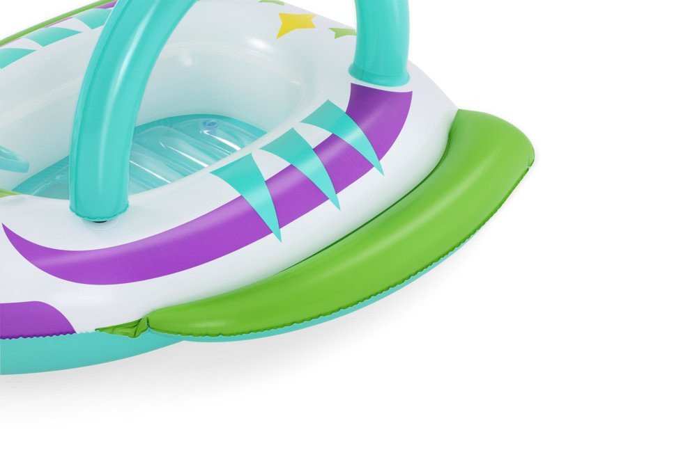 Bestway felfújható csónak 107cm x 112cm 34149Ha gyermeke szeret a vízben lenni, vagy csak most ismerkedik a vízzel, szerelje fel egy úszógumival. A ponton könnyű és praktikus, összecsukás után nem foglal sok helyet, így könnyen szállítható. Az érdekes színek továbbá arra ösztönzik gyermekét, hogy játsszon a vízben. A gumicsónak 3 éves kortól gyermekek számára készült. További előny a felfújható alj és a tető, amelyek biztosítják, hogy a kisgyermek kényelmesen érezze magát. A beépített kormánykerék kürttel további látványosságokat biztosít. A csónak tartós, sérülésálló vinilből készült.  Főbb jellemzők:- méretek 107cm x 112cm- felfújható alj átlátszó ablakkal- színes grafika Minnie egérrel- tartós PVC anyag- levehető napellenző- 3 éves kortól gyermekek számára készültSúly:1 kgA csomag mérete:25 cm x 25 cm x 9 cm