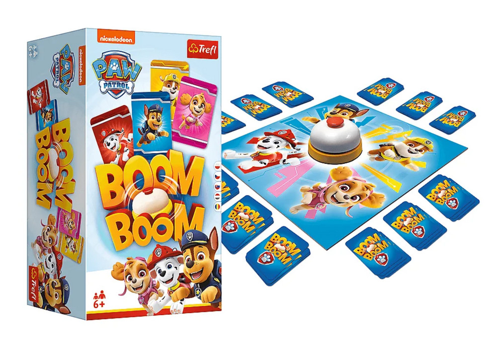 Boom Boom Mancs őrjárat árkádjáték Trefl 01911 Boom Boom - A Mancs őrjárat egy dinamikus családi játék, amely kézügyességet, megfigyelőképességet és jó reflexeket igényel. A Boom Boomban a játékosok megpróbálnak összegyűjteni ugyanolyan hősöket a "Mancs őrjárat" című gyermek rajzfilmből. A játékosok egyszerre cserélik ki kártyáikat a táblán lévő kártyákkal. Miután elkapnak 4 ugyanolyan karaktert, a játékos megkondítja a csengőt, és jelzi az elkészült pakli összegyűjtését. A játékosok azonos típusú kártyákra vadászhatnak, ami még izgalmasabbá teszi a játékot. Az a játékos nyer, aki összegyűjti az összes Mancs őrjárat hőskészletét! A doboz tartalma: 56 kártya, csengő, tábla, útmutató