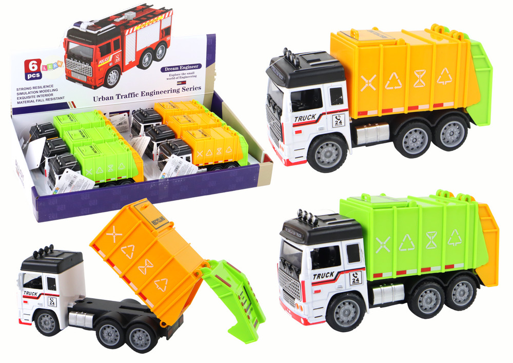 Szemétszállító utánfutó 2 színben   Ez egy lenyűgöző játék, rendkívül realisztikus megjelenéssel, amelyben minden részlet tökéletesen kidolgozott. A jármű felületén számos feliratot és táblát találsz, amelyek hiteles karaktert kölcsönöznek neki. A nyitható, mozgó utánfutó interakciós és játéklehetőségeket kínál. Ennek köszönhetően realisztikus helyzeteket játszhatsz el, amelyekben egy kukásautó hulladékot gyűjt és kiürít. A jármű tetején egy zárható nyílás található, így a szemétgyűjtést úgy szimulálhatod, hogy kinyitod és beledobod a hulladékot. A kukásautó súrlódós meghajtással rendelkezik, amely lehetővé teszi, hogy könnyen mozogjon a felületen. A kiváló minőségű műanyag, amelyből készült, biztosítja a tartósságát és szilárdságát, ami azt jelenti, hogy sokáig szolgálni fog. Kompakt méretei: 13 cm x 7 cm x 5 cm, így tökéletes méretű a kis kezek számára. Ez egy tökéletes játék a kis járműkedvelők számára, amely lehetővé teszi számukra, hogy mindennapi helyzeteket játsszanak el és fejlesszék kreativitásukat! Elérhető színek: - zöld - narancs   Jármű méretei: 13 cm x 7 cm x 5 cm   Csomag mérete: 13 cm x 7 cm x 5 cm   Mennyiség a fő kartonban: 6   CE tanúsítvánnyal rendelkezik és megfelel az EN71 szabványnak. A játék 3 év feletti gyermekek számára készült.