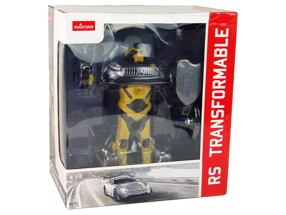 Távirányítós Mercedes Rastar Irányított Robot Transformers Autó 1:14   Ez a távirányítós autómodell a Mercedes-AMG GT3 hiteles másolata. Ezüst színe és sárga kiegészítői dinamikus és egyedi megjelenést kölcsönöznek neki. A jármű hátulján egy jellegzetes spoiler található, amely kiemeli az autó sportos jellegét. Ez a játék 1:14 méretarányban készült, ami azt jelenti, hogy kisebb, mint az igazi Mercedes-AMG GT3, de számos részletet és arányt megtartott, hogy a lehető legjobban tükrözze az eredeti megjelenését. Ez nem csak egy távirányítós autó - kibontva ez a modell lenyűgöző Transformers robottá alakulhat. Az átalakulási képesség extra szórakozást és lehetőségeket ad ehhez a játékhoz, lehetővé téve gyermeked számára, hogy két különböző módot fedezzen fel. Ez a távirányítós autó nemcsak mozog és robottá alakul, hanem fény- és hanghatásokkal is rendelkezik. Autóvezetés vagy robotként való harc közben valósághű motorhangokra, robothangokra és egyéb hanghatásokra számíthatsz, amelyek hitelességet és még nagyobb szórakozást kölcsönöznek. Amikor az autó robottá alakul, sárgára változik, és egy pajzsot és egy fejszét visel. Ez a robot lenyűgözően néz ki, és tökéletes karakter különféle forgatókönyvekben és akciókban való eljátszáshoz. Ez a játék ötvözi a távirányítós autók és a Transformers figurák legjobb tulajdonságait, így gyermekének nemcsak nagyszerű szórakozást kínál egy távirányítós járművel, hanem lehetőséget ad arra is, hogy kreatívan és dinamikusan játsszon átalakuló robotként. A valódi Mercedes-AMG GT3-ból ismert fény-, hanghatásokkal és részletekkel ez a játék rengeteg izgalmat és képzelőerő-fejlesztési lehetőséget kínál.   A készlet tartalma: - Mercedes auto-robot 1:14 - Távirányító - Eredeti csomagolás - Használati útmutató   Jármű méretei: teljes magasság 31 cm teljes hossz 41 cm teljes szélesség 25 cm   Pilóta méretei: 15cm x 14cm x 4cm   A csomag mérete: 35cm x 39cm x 23cm   A járművet négy 1,5V-os AA elem, a távirányítót három 1,5V-os AAA elem táplálja (a készlet nem tartalmazza az elemeket) A játék 6 év feletti gyermekek számára készült, pl. A termék CE minősítéssel rendelkezik és megfelel az EN71 szabványnak.