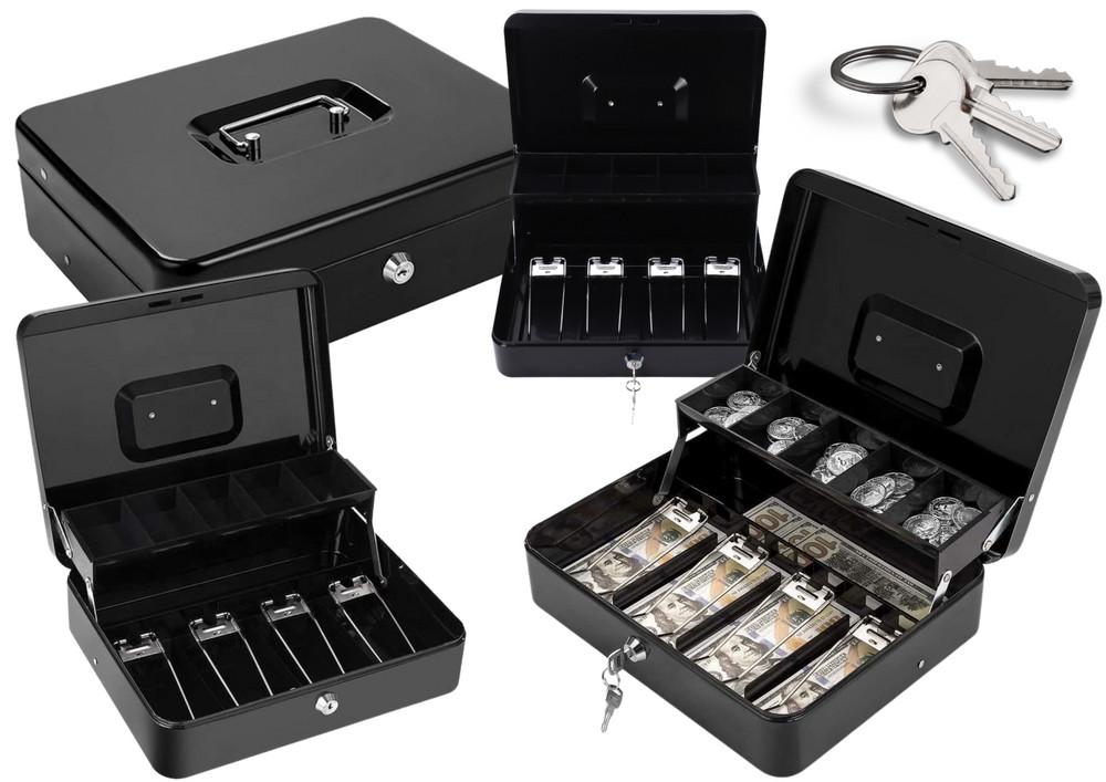 Pénztár bankjegyek, érmék, kulcsok, fém, fekete