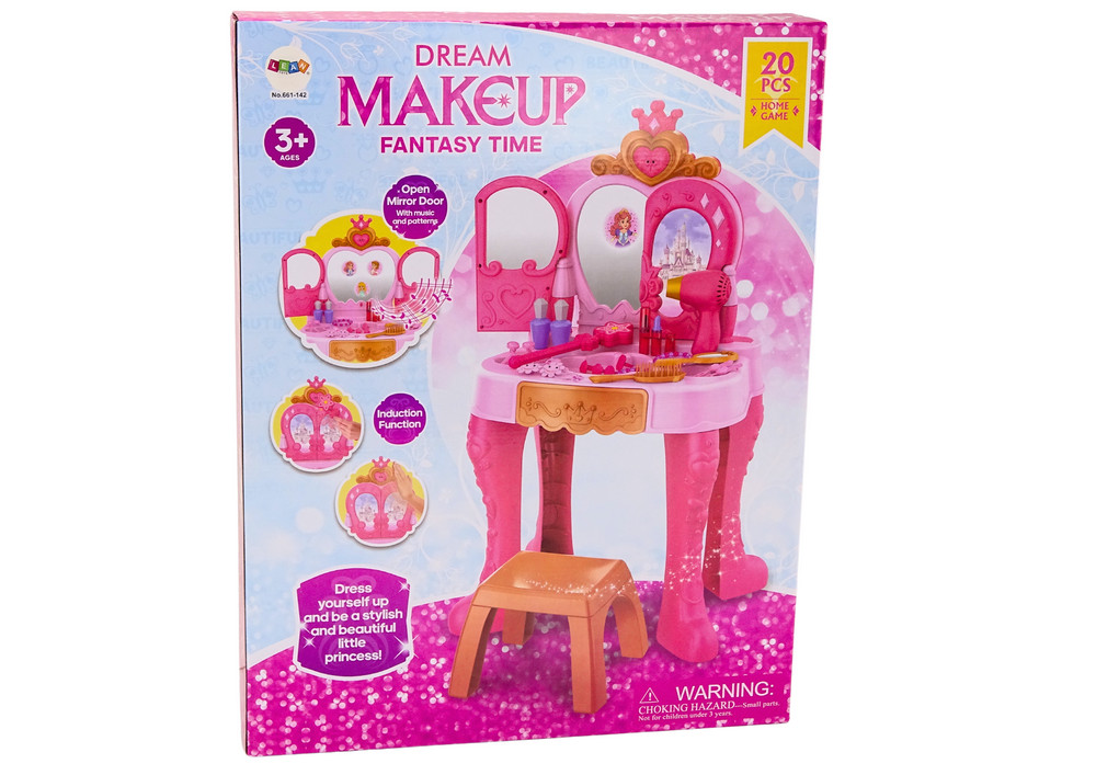 Gyerek Fésülködőasztal Gesztusérzékelő Kiegészítőkkel, Rózsaszín Egy varázspálcás fésülködőasztal egy rendkívüli oázis minden kis hercegnő számára, amely már a reggel elején elrepíti őt a mesék és a varázslat világába. Fő előnye a multimédiás funkció, ahol a tükrök szinte úgy nyílnak, mint egy varázslatos királyság kapuja, mindössze annyit kell tennie, hogy közelebb hozza a kezét. Ez nemcsak praktikus megoldás, hanem egy varázslatos pillanat is, amelyet a gyerekek szeretnek megismételni. A készlet széles választékban tartalmaz kiegészítőket, amelyekkel minden fiatal hölgy igazi hercegnőnek érezheti magát. A fésülködőasztal tetején egy fiók található, amely tökéletes ékszerek, hajpántok vagy csatok tárolására - minden, ami egy varázslatos frizura létrehozásához szükséges. Ezenkívül a készlet tartalmaz két rúzst, körömlakktartót és egy bájos hajszárítót, amelyek még több realizmust és örömet adnak a játéknak. Számos olyan elem is található, amelyek csábítják az érzékeket és fejlesztik a kreativitást. A hercegnő órákat tölthet a tükör előtt, új frizurákat és stílusokat alkotva, kedvenc dallamai hangjait hallgatva. Ez a mesés fésülködőasztal nemcsak játék, hanem eszköz is a gyermek képzelőerejének, kreativitásának és önbecsülésének fejlesztésére. Ez egy olyan hely, ahol a gyönyörű hercegnő álmai valósággá válnak, és minden nap egy varázslatos kalanddal kezdődik a saját képzeleted birodalmában. Az öltözőasztal 3 db 1,5 V-os AA elemmel működik, amelyek nem részei a készletnek. A szárítógép 1 db 1,5 V-os AA elemmel működik, amelyek nem részei a készletnek. Az öltözőasztal méretei: 68cm x 47cm x 27cm. A csomag mérete: 68cm x 53cm x 10cm. CE tanúsítvánnyal rendelkezik és megfelel az EN71 szabványnak. 3 év feletti gyermekek számára készült.