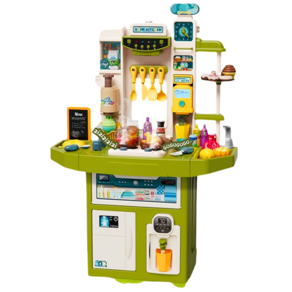 GYERMEKKONYHA SPRAY HOME KITCHEN 71 ELEM A nagyméretű SPRAY HOME KITCHEN gyerekkonyha kiváló választás a kis főzés szerelmeseinek. Akár 71 elemmel felszerelve, lehetőséget biztosít a gyerekeknek a szabad, kreatív és valósághű szórakozásra a főzés, sütés, tálalás és mosogatás során. A gazdag kiegészítőkészlet többek között edényeket, evőeszközöket, élelmiszereket, zöldségeket, gyümölcsöket, tányérokat, italokat és fűszereket tartalmaz, amelyeknek köszönhetően a gyermek igazi konyhában érezheti magát. A játékkonyha számos modern interaktív funkcióval van felszerelve: gőzhatás, valósághű főzési hangok, színes LED-lámpák, valamint zenei és hangos történetek, amelyek a vezérlőpanel segítségével aktiválhatók. Az ilyen megoldások még több örömet garantálnak, és hosszú, lebilincselő játékra ösztönzik a gyermeket. A konyha masszív szerkezetű, és akár 100 cm-es magasságot is elér, így még az idősebb gyermekek számára is kényelmes és vonzó. Van még egy működő vízkeringtetéssel ellátott mosogató, egy nyitható elejű sütő, egy égőfejekkel és polcokkal ellátott tűzhely, valamint egy tartozékok számára kialakított tárolóhely. A konyhában való játék nemcsak szórakoztató, hanem fejleszti a képzeletet, a kézügyességet és a szem-kéz koordinációt is. A szerepjátékos házimunkák a gyerekeket önállóságra, szervezőkészségre és logikus gondolkodásra tanítják. Ez egy olyan játék, amely egyszerre tanít, szórakoztat és inspirál, nagyszerű időtöltési lehetőséget kínálva - egyedül vagy társaikkal. SPECIFIKÁCIÓ: Konyha méretei: 70 x 34,2 x 100 cm Csomag méretei: 71 x 47,5 x 18,5 cm Tápellátás: 6 x 1,5 V AA elem (nem tartozék) Hatások: gőz (permet), főzési hangok, zene, LED világítás Funkciók: mosogató csappal és vízkeringetéssel, égők, hang- és fénypanel Elemek száma: 71 Anyag: műanyag A SZETT TARTALMA: Konyha munkalappal, mosogatóval, polcokkal és sütővel Edények, serpenyők, fedők, evőeszközök és merőkanalak Palackok, zöldségek, gyümölcsök, étlap Élelmiszerek és egyéb kiegészítők