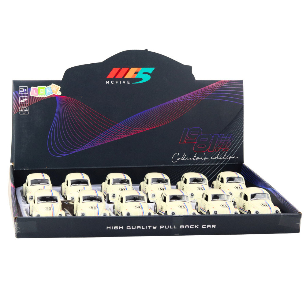 1:32 FÉM BOGÁRAUTÓ HÁTRAHÚZÓS HAJTÁSSAL ÉS NYITHATÓ AJTÓKKAL Ez az 1:32 méretarányú fém Bogárautó egy klasszikus autók ihlette egyedi modell, amely megjelenésében és funkcionalitásában is magával ragadó. A kiváló minőségű fémből készült játék tartós és masszív, mindennapi használatra alkalmas. A bézs karosszéria elegáns, ikonikus karaktert kölcsönöz a járműnek, az aprólékosan kidolgozott részletek pedig mind a gyerekeket, mind a klasszikus autók rajongóit lenyűgözik. Az autó hátrahúzós meghajtással van felszerelve, amely lehetővé teszi, hogy a jármű enyhe hátramenetben mozogjon. Ez a tulajdonság dinamikussá, lebilincselővé és izgalmassá teszi a játékot. A nyitható ajtók lehetővé teszik, hogy bekukkantson a modell belsejébe, ami tovább fokozza a mindennapi játékot és ösztönzi a szerepjátékot. Kompakt méretének köszönhetően könnyen tartható, tárolható és utazásokra is magával vihető. Tökéletes az autók iránt érdeklődő gyermekek számára, és nagyszerű kiegészítője azoknak a gyűjteményének, akik értékelik a klasszikus autóipari formatervezést. A többcsomagos csomag 12 darabot tartalmaz. Mindegyik külön kapható.SPECIFIKÁCIÓK:Autó méretei: 12,5 x 4,5 x 4,5 cmAnyag: fém karosszéria + műanyagMeghajtás: visszahúzhatóAjtók: nyílóSzín: bézsMéret: 1:32Modell: Egy klasszikus Bogár mintájáraKonstrukció: öntöttRendeltetés: szórakozás, gyűjtésAlkalmazás: vezetés sík felületenTovábbi jellemzők: realisztikus részletek, tartós konstrukcióTöbbcsomagos méretek: 40 x 29,5 x 5,5 cmKÉSZLET TARTALMA:Fém autó 1:32