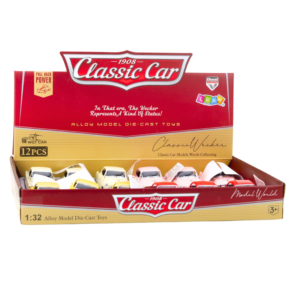 KLASSZIKUS FÉM AUTÓ HÁTRAHÚZÓS HAJTÁSSAL ÉS NYITHATÓ AJTÓKKAL Ez a klasszikus retró stílusú autó kötelező darab mind a gyerekek, mind a gyűjtők számára. Fémből és műanyag elemekből készült, hihetetlenül elegánsnak tűnik – a króm részletek, a jellegzetes 1950-es évekbeli sziluett és az élénk színek egy igazi, régmúltbeli autó miniatűr változatának látszanak. Az autó hátrahúzós meghajtással rendelkezik – egyszerűen húzd hátra, és elengedéskor magától előrehajt. További előny a nyitható ajtók, amelyek fokozzák a játék realizmusát, és lehetővé teszik a gyerekek számára, hogy különböző jeleneteket játsszanak el. Masszív szerkezetének és klasszikus kialakításának köszönhetően ez a modell tökéletes játéknak és gyűjtésnek egyaránt. Ez egy olyan játék, amely fejleszti a képzeletet, a finommotoros készségeket, és rengeteg szórakozást nyújt. 12 darab található egy többcsomagos csomagban. Külön kapható. A szín véletlenszerűen kerül kiválasztásra. MŰSZAKI ADATOK: Autó méretei: 12,5 x 5 x 4 cm Csomag méretei: 37,5 x 30 x 5,5 cm Anyag: fém + műanyag alkatrészek Meghajtás: visszahúzós (visszahúzáskor automatikus) Jellemzők: nyíló ajtók Méretarány: 1:32 Stílus: klasszikus retró autó az 1950-es évekből Színek: különböző változatok (pl. piros, rózsaszín, sárga, krém) SZETT TARTALMA: Klasszikus fém autó 1:32