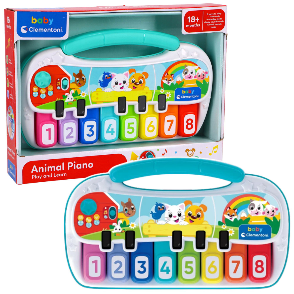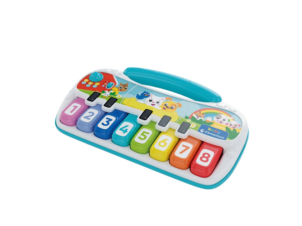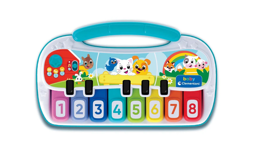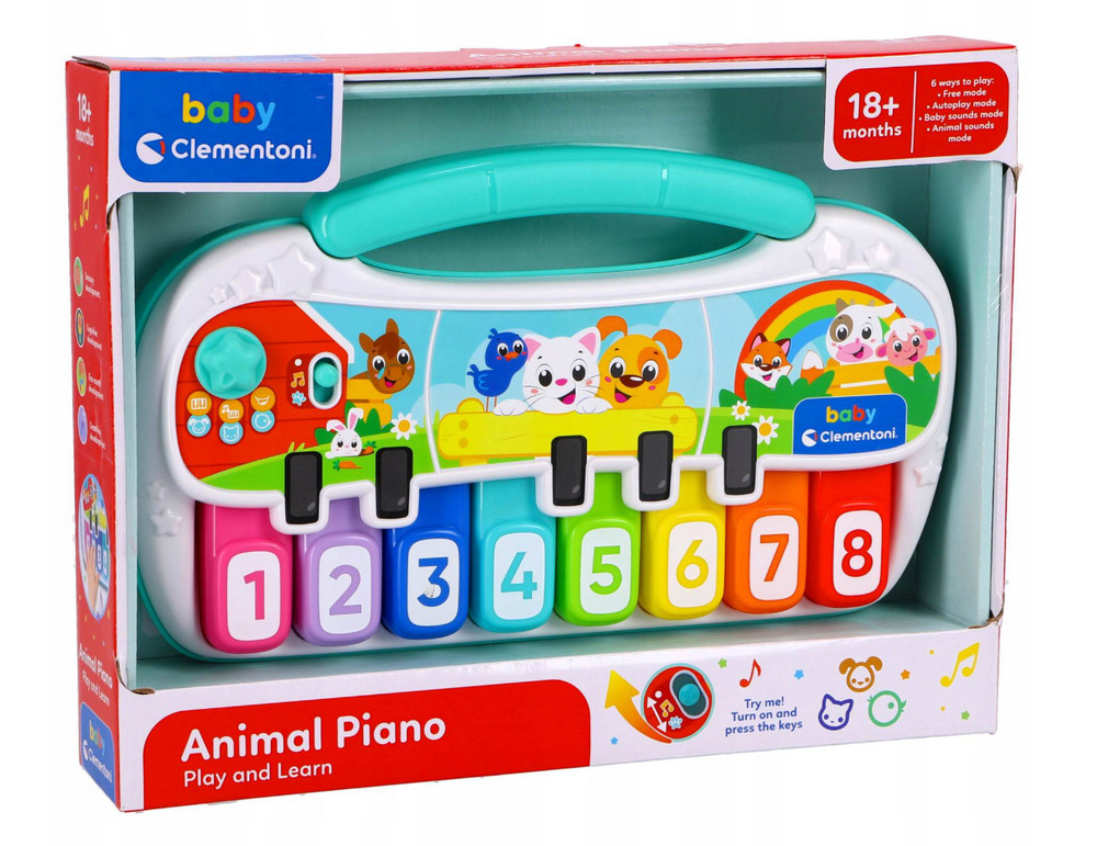 Színes Állatos Zongora Clementoni 17950A vidám és színes állatos zongora a tökéletes első zenei játék a kicsiknek. Támogatja a gyermek természetes kíváncsiságát, és egyszerű és intuitív módon, játékon keresztül ösztönzi a hangok világának felfedezését. 3 játékmód tanulás és szórakozás egyben Zenei billentyűzet a gyermek saját dallamokat alkothat, vagy egyszerű kezdő kottákat követhet Az éneklő billentyűzet segít megérteni a hangjegyek és a hang közötti kapcsolatot Az oktató billentyűzet lebilincselő módon tanítja meg az első számokat és színeket Interaktív funkciók Két interaktív oldal, amelyek megragadják a gyermek figyelmét Vidám dalok és mondókák Állatnevek Rövid mondókák, amelyek támogatják a beszédfejlesztést Zenei fejlesztés Támogatja a finommotoros készségeket Fejleszti az érzékszervi képességeket Elősegíti a beszéd és a zenei hallás fejlődését Könnyen hordozható Praktikus fogantyú lehetővé teszi, hogy a zongorát bárhová magaddal vihesd otthon, sétálni vagy kirándulásra A zene mindig kéznél van Termékleírás 18 hónapos kortól Doboz méretei 29 × 22 × 5,5 cm Súly 460 g Tápegység 2 × AAA LR03 Elemek mellékelve: igen Olaszországban tervezték és fejlesztették