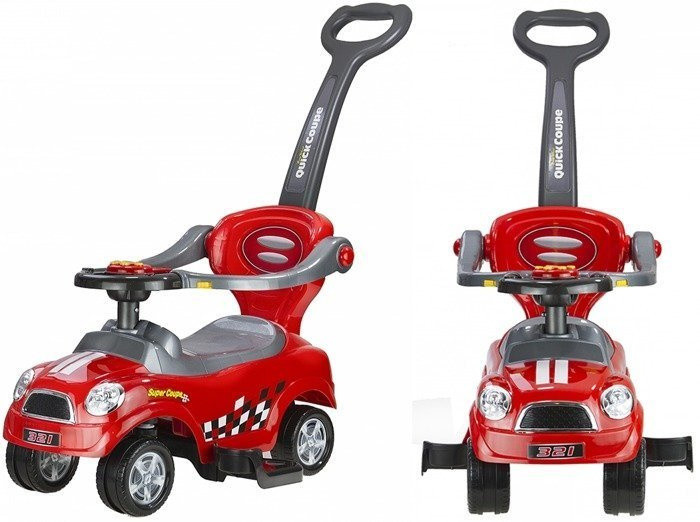 Kupé autó, kézi vezetéssel, szülői fogantyúval - Piros   Úgy tervezték, hogy a babák és kisgyermekek, akik már megtanultak ülni és mászni, pontosan azt próbálhassák ki, amire szükségük van: az erőteljes, ismétlődő lábmozgásokat. Egy új élmény, amely előrébb viszi a kisgyermekeket a fejlődésükben. Ez a klassz, tolókocsi tolórúddal és háttámlával, nagyszerű ajándék minden gyermek számára. Az alacsony ülésmagasság lehetővé teszi, hogy gyermeke könnyen be- és kiszálljon az autóból. Az autó jó súlyponttal és ergonomikus üléssel rendelkezik. A tolórúd, a lábtámaszok és a biztonsági rudak levehetők. Az ülés alatti tárolórekesz megkönnyíti, hogy minden fontos apróságot magával vihessen az útra. A hangeffektek még szórakoztatóbbá teszik az utazást!  Csak felnőtt felügyelete mellett használható! Nem alkalmas közúti használatra.  Méretek: Magasság tolórúddal - 85 cm Szélesség - 40 cm Hosszúság - 60 cm   18 hónapos kortól + CE tanúsítvánnyal rendelkező gyermekek számára alkalmas
