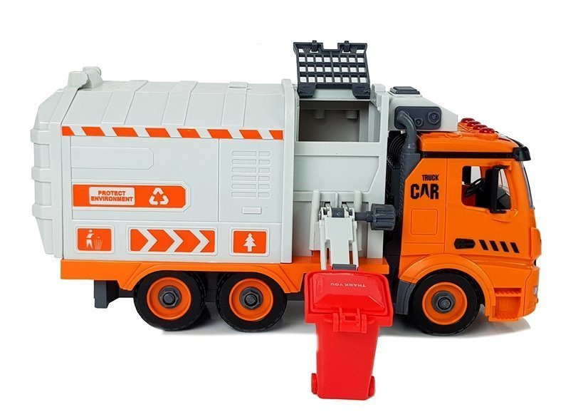 A DIY Garbage Truck hulladékválogató játék csavarhúzóval hang-fényeffekt készlet minden fiúnak órákig tartó fantasztikus szórakozást nyújt. Ez az egyedi játék fantasztikus kiegészítője lesz egy járműgyűjteménynek, valamint egy olyan játék, amely nem válik egyhamar unalmassá. A jármű klasszikus narancssárga színvilággal rendelkezik, fekete és szürke részletekkel. A kukásautó futófelületű kerekeken ül, így a gyerekek különféle felületeken használhatják. Az autó egyenes úton haladhat egyszerűen tolva. A gyártásához felhasznált anyagok nagyon jó minőségűek, ami pozitívan befolyásolja a játék tartósságát és minőségét. A kerekek és a mozgó alkatrészek összekapcsolására használt csavarok tömör műanyagból készültek, amelyeket a mellékelt, cserélhető hegyű csavarhúzóval könnyen meg lehet húzni. A jármű 6 szabadon forgó keréken ül, így sík felületeken is vezethető. Az autó egy mozgatható fedéllel ellátott tartállyal van felszerelve, amely könnyen felemelhető. Ez a játék nagyszerű módja lehet annak, hogy megtanítsd a kicsinek a hulladékválogatás és -újrahasznosítás alapelveit. A természet gondozása fontos, és a játékon keresztül nem fogják kötelességnek érezni ezt. Valójában nagyon szórakoztató és élvezetes lesz. A készlet különféle tárgyakat ábrázoló kártyákat tartalmaz (angol nyelven címkézve - nagyszerű módja az idegen nyelv tanulásának), amelyeket a megfelelő kukába kell helyezni. Ez a játék megtanítja a hulladék megfelelő válogatására. Az autó tetején 4 gomb található, amelyek hang- és fényeffektusokat aktiválnak. A készlet 4 tartályt tartalmaz. A hátsó rámpa felnyílik, így könnyen kidobhatja a hulladékot és kiürítheti a tartályt a szeméttelepen. A készlet elemei: - szemetesautó - 4 szemeteskuka: szürke, zöld, kék, piros - csavarhúzó cserélhető bitekkel - csavarok - a játékszabályokat leíró útmutató - 40 játékkártya A kiválasztott készletelemek méretei: - szemetesautó: 31 cm x 15 cm x 11 cm - hulladékkukák: 6 cm x 5,5 cm x 4,5 cm Doboz méretei: 48 cm x 32,5 cm x 11,5 cm Az autót három 1,5 V-os LR44 elem táplálja (tartozék). A játék 3 év feletti gyermekek számára készült. A készlet CE minősítésű és megfelel az EN 71 szabványnak. Átlátszó kijelzővel ellátott dobozban érkezik, így tökéletes ajándék.