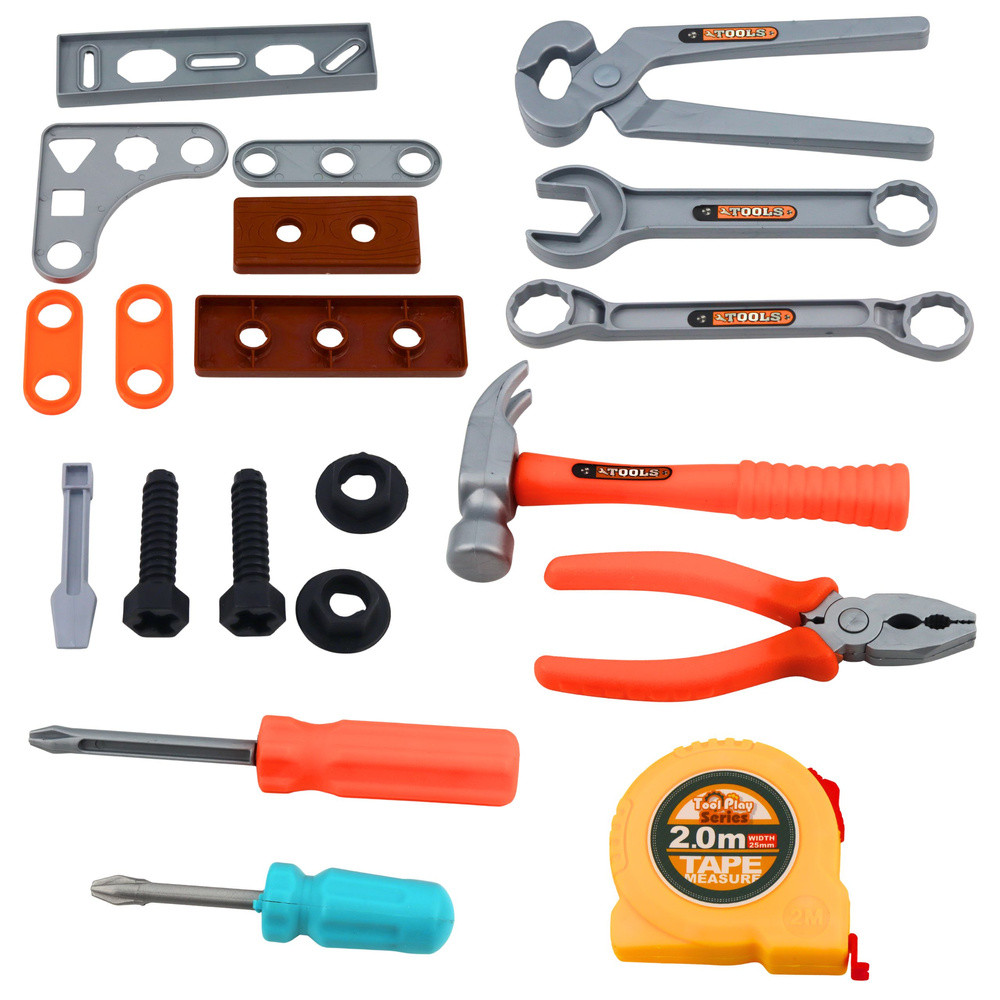 NAGY GYERMEK FŰRÉSZ, SISAK, SZEMÜVEG ÉS KESZTYŰ KÉSZLETEz a nagyméretű gyermek szerszámkészlet tökéletes a kicsiknek, akik imádják utánozni a felnőtteket a mindennapi tevékenységek, például kertészkedés, kisebb javítások vagy takarítás során. A szerepjáték fejleszti a gyerekek kíváncsiságát, kreativitását és kézügyességét, miközben logikus gondolkodást és önállóságot is tanít. Ez a készlet lehetővé teszi számukra, hogy igazi ezermesterekké és biztonságos segítőkké váljanak, órákig tartó, lebilincselő játékot biztosítva. A készlet központi eleme egy játék láncfűrész, amely hangeffektusokkal és biztonságos, forgó pengével van felszerelve, amely valósághűen utánozza egy igazi szerszám működését. A húzóindító és a ravasz még dinamikusabbá és lebilincselőbbé teszi a játékot a gyerekek számára. A biztonsági kiegészítők, mint például a sisak, a védőszemüveg és a kesztyű, nemcsak fokozzák a szórakozást, hanem az alapvető biztonsági szabályokat is megtanítják munka közben. A készletet a gyermekek kényelmét és biztonságát szem előtt tartva tervezték, robusztus felépítése és gondosan kiválasztott darabméretei pedig kényelmessé és élvezetessé teszik a játékot. Tökéletes mind beltéri, mind kültéri játékhoz, lehetőséget kínálva a gyerekeknek az aktív időtöltésre és a kéz-szem koordináció fejlesztésére. MŰSZAKI ADATOK:Terméktípus: Gyermek szerszámkészletCél: Tematikus barkácsjátékAnyag: MűanyagSzínek: Narancssárga, fehér és feketeEffektek: HangMechanizmus: Kézi indító és nyomógombosFunkciók: Láncfűrész működését utánozzaFejlődési előnyök: Finommotoros készségek, kéz-szem koordináció, kreativitásFűrész méretei: 46,5 cm x 16 cmSisak méretei: 23 cm x 18 cmCsomag méretei: 54,5 cm x 21 cm x 14,5 cmTápellátás: 3 x AA elem (nem tartozék)A KÉSZLET TARTALMA:Játékfűrész hangeffektusokkalVédősisakVédőszemüvegMunkakesztyűkKézi fűrészSzerszámkészlet