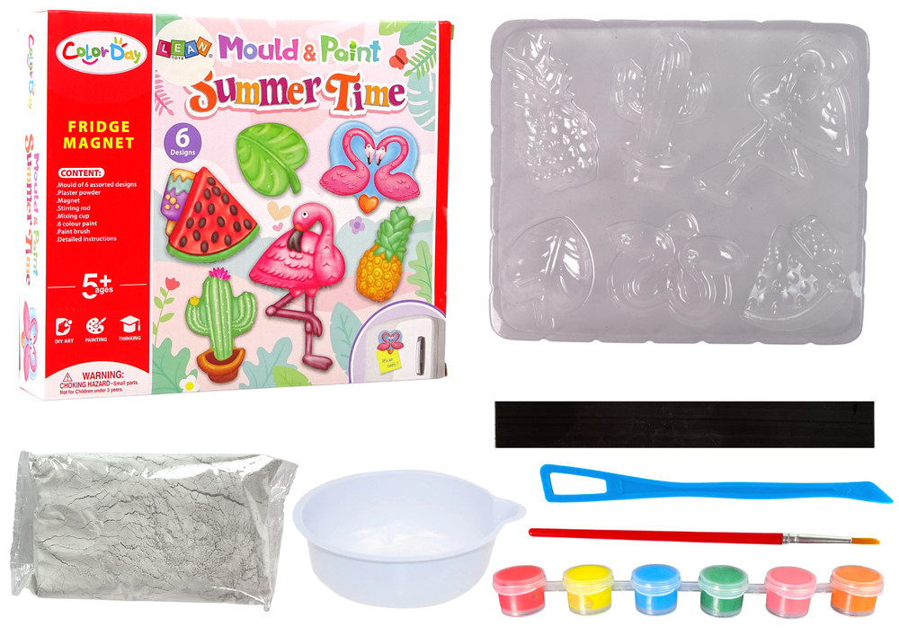 Saját készítésű festőkészlet ünnepi flamingó görögdinnye gipszmágnesek A kreativitás fejlesztése különösen fontos a kisgyermekeknél, amikor elkezdenek szocializálódni társaikkal. A közös alkotás pozitív hatással van az interperszonális kapcsolatokra, és megtanítja a gyerekeket az együttműködésre. Bemutatjuk a saját készítésű készletet, amellyel cupcake-eket készíthetsz, majd kifestheted őket. A hűtőmágnesek készítéséhez használt színes készlet ideális szórakozás kicsiknek és nagyoknak egyaránt. A készletben található gipsz segítségével gyönyörű állatokat, gyümölcsöket és növényeket hozhatsz létre, amelyek az ünnepekhez kapcsolódnak. Hogyan kezdj hozzá a kreatív játékhoz? 1) Keverd össze a gipszet vízzel az utasításoknak megfelelően, töltsd meg az előkészített formákat gipsszel, és hagyd megszáradni. 2. Miután a formák megszáradtak, kivehetők a formákból. 3. Fesd szabadon a mellékelt színes festékekkel. 4. Amikor befejezted a díszítést, ragassz megfelelő hosszúságú mágnest a formákra. Miután minden lépést elvégeztél, a házi készítésű mágnesek készen állnak! A készlet tartalma: -forma öntőformákkal (flamingók, ananász, levél, kaktusz, görögdinnye) -egy csomag gipsz - 6 db-os tintakészlet - ecset - 15 cm x 2 cm-es lapos, öntapadós mágnes - a készlet használati utasítása A bagoly méretei: 4 cm x 4 cm x 2 cm A csomag méretei: 27 cm x 23 cm x 5 cm A játék 5 év feletti gyermekek számára alkalmas. CE tanúsítvánnyal rendelkezik és megfelel az EN71 szabványnak.