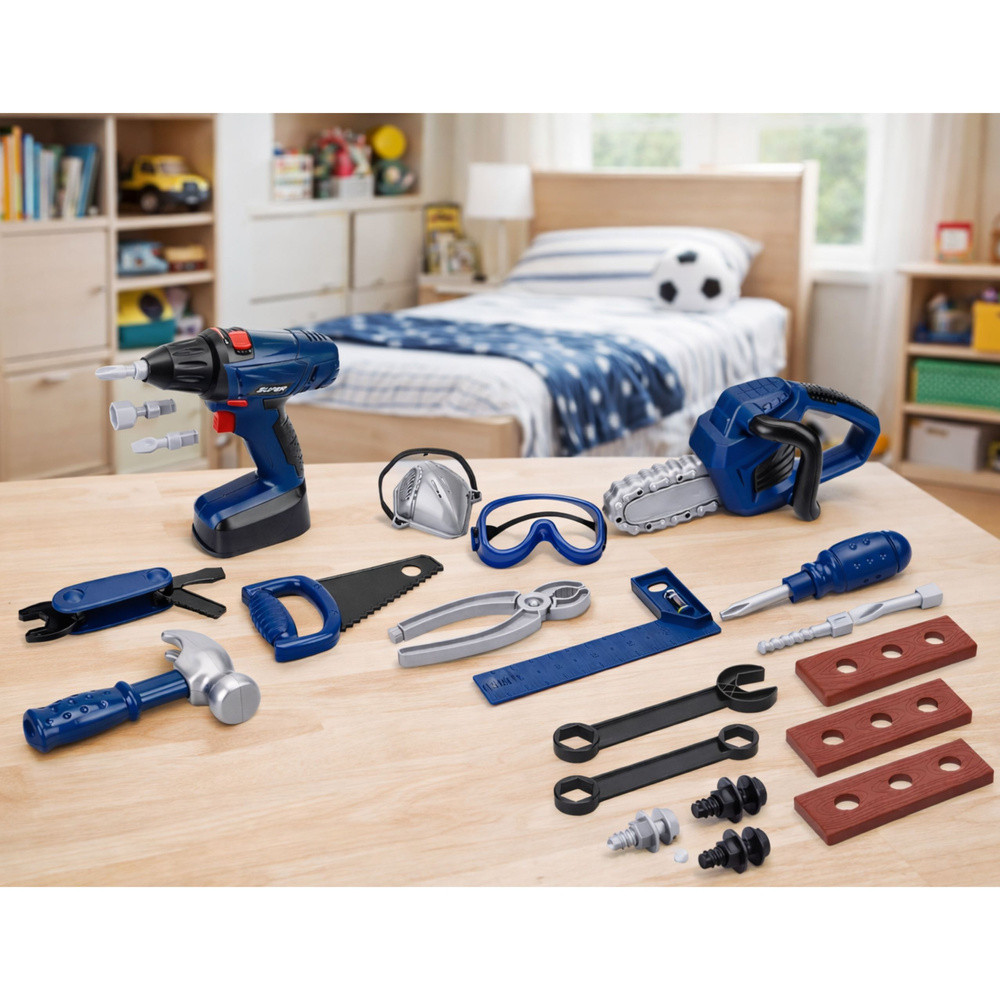 GYERMEK SZERSZÁMKÉSZLET: CSAVARHÚZÓ SZERSZÁMLÁZ 30 RÉSZESEz a praktikus szerszámosláda tökéletes a kis barkácsolók számára, akik élvezik a felnőttek utánzását a házimunka és a javítások során. A kiegészítők széles választéka lehetővé teszi a gyerekek számára, hogy barkácsolással, készülékek javításával vagy különféle szerkezetek építésével kapcsolatos szerepjátékokat játsszanak el. A nagyszámú darab még realisztikusabbá és lebilincselőbbé teszi a játékot. A készlet tartalmaz egy játék elektromos csavarhúzót és különféle szerszámokat, például kalapácsot, villáskulcsot, csavarhúzót, fűrészt, fogót és összeszerelő szerszámokat. A gyerekek összeszerelhetik az alkatrészeket, saját projekteket készíthetnek, és megismerkedhetnek a műszaki munkában használt alapvető eszközökkel. Minden alkatrész könnyű és tartós műanyagból készült, így biztonságosan és könnyen használhatóak a gyermekek számára. A készlet egyik nagy előnye a praktikus, fogantyúval ellátott szerszámosláda, amely lehetővé teszi az összes alkatrész egy helyen történő tárolását. Ez lehetővé teszi a gyerekek számára, hogy könnyen szállítsák a szerszámkészletüket, és a játék után rendszerezve tartsák. A szerszámkészlettel való játék fejleszti a képzeletet, a kézügyességet és a logikus gondolkodást. Nagyszerű módja a kreatív játéknak otthon, és nagyszerű ajándékötlet a barkácsolás iránt érdeklődő gyerekeknek. SPECIFIKÁCIÓK:Játék típusa: Gyermek szerszámkészletTermék típusa: Szerszámosláda kiegészítőkkelDarbszám: 30 darabFő eszköz: Játék csavarhúzóCsavarhúzó tápegység: 2x 1,5 V AA (nem tartozék)Anyag: Kiváló minőségű műanyagSzínek: Fekete és kékRendeltetés: BarkácsolásGyermekfejlődés: Kreativitás, Kézügyesség, Motoros koordinációSzerszámosláda méretei: 29 x 17 x 16,5 cmCsavarhúzó méretei: 14,5 x 5 x 18 cmA KÉSZLET TARTALMA:SzerszámosládaJáték csavarhúzóKalapácsFűrészNyílt végű villáskulcsÁllítható villáskulcsCsavarhúzóFogóRögzítőelemekDíszlécekRögzítőfuratokVédőszemüvegVédőmaszkTovábbi szerszámtartozékok