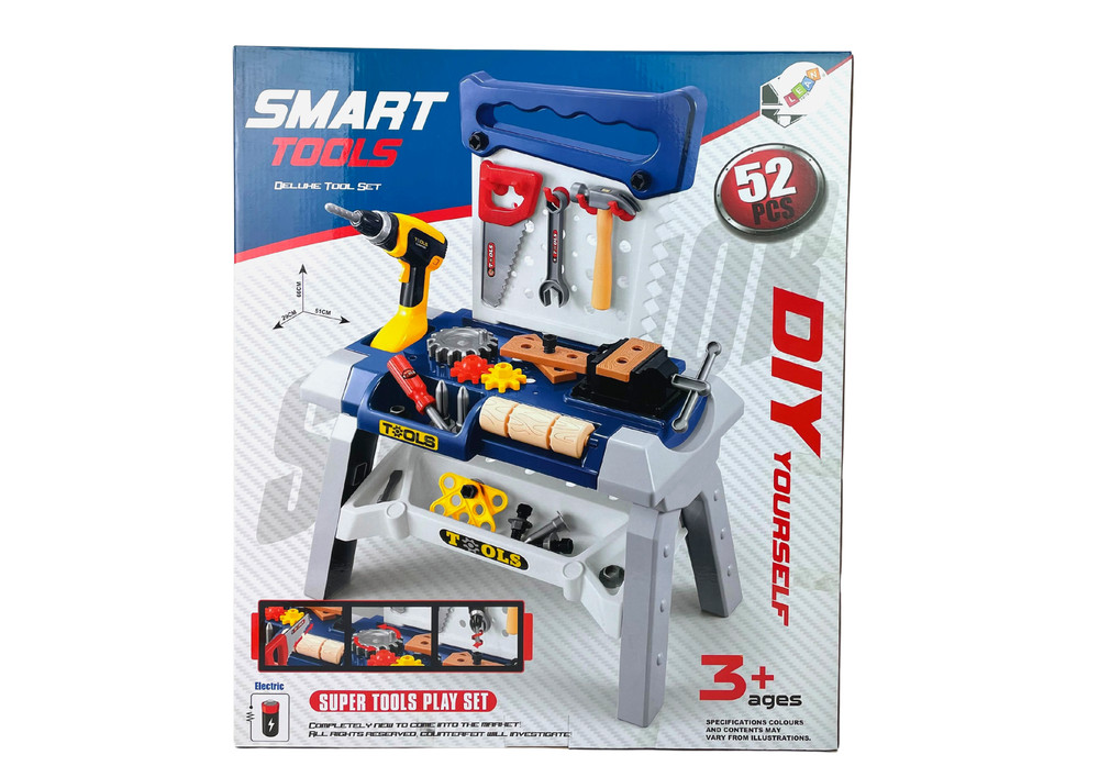 Barkácsműhely készlet szerszámokkal és fúróvalRengeteg szerszám, csavar leköti a kisfiúkat órákig, utánozni akarják az apjukat. Egy pár éves gyerek biztosan felnőttebbnek érzi majd magát tőle, és megtanul bütykölni is. De ez csak egy a sok előny közül, játék közben biztosan javítja a pontosságát és a kézkoordinációját. A legfontosabb előny pedig az, hogy kreatívan töltheti az idejét azzal, amit örömmel csinál.Miután behelyezzük az elemeket a fúróba és megnyomjuk a gombot, a fúró úgy forog, mint egy igazi fúró, ráadásul két cserélhető bittel rendelkezik, így bármilyen típusú csavar belefér.A készlet 52 darabból áll. A teljes műhely sötétkék és szürke színvilágú, és tökéletesen illik bármilyen szobába. A játék kevés helyet foglal, könnyen össze- és szétszerelhető.A szerszámok kiválóan kidolgozottak és igényesek, teljes egészében műanyagból készültek. Tökéletesen formázottak, hogy minden kis kézbe beleférjenek. A különböző színek vonzzák a kisgyermek figyelmét és serkentik a látást. A készlet elemei: - a műhely összeszereléséhez szükséges elemek - elemes fúró - cserélhető bitek - satu - csavarok és anyák - fűrész - fogaskerekek - fogó - villáskulcs - kalapács - csavarhúzók - fa - tartályok a műhelyhez - akasztók készlet - deszkák a csavarozáshoz, Műhely méretei: 50 cm x 30 cm x 66 cm Csomagolás méretei: 54 cm x 48 cm x 11 cm A fúró két 1,5 V-os AA elemmel működik. 3 év feletti gyermekek számára alkalmas. A játék egy nagy kartondobozban van csomagolva és CE tanúsítvánnyal rendelkezik, így szenzációs ajándékötlet. A készletben található összes elem kiváló minőségű műanyagból készült, ami garantálja a használat biztonságát és a játék hosszú élettartamát.