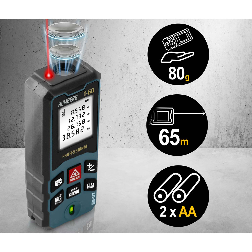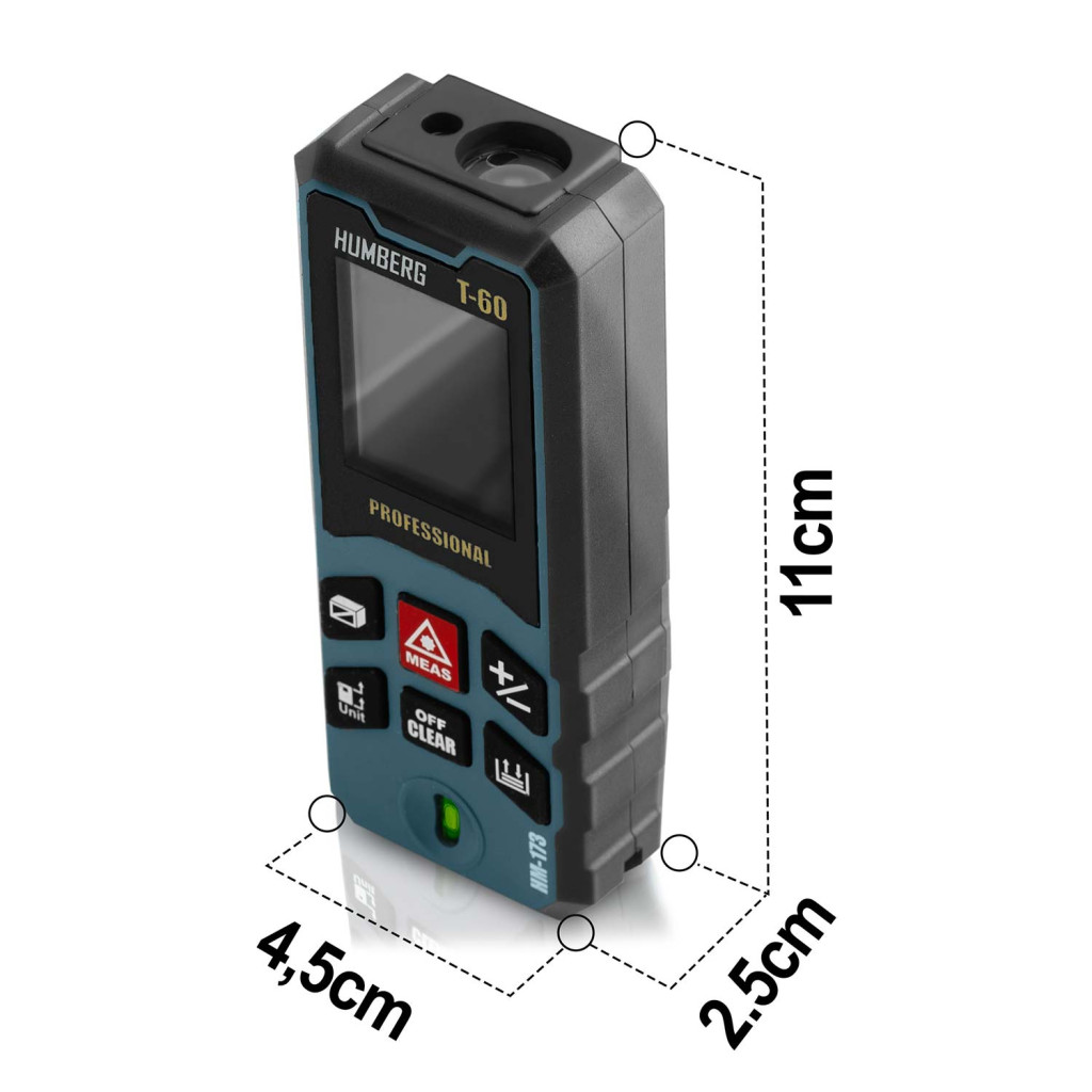 A HUMBERG T-60 lézeres távolságmérővel akár 65 métert is megmérhet, ami egy teljes futballpálya szélessége! Ez lehetővé teszi nagy távolságok pontos mérését mind a munkahelyen, mind a pályán.