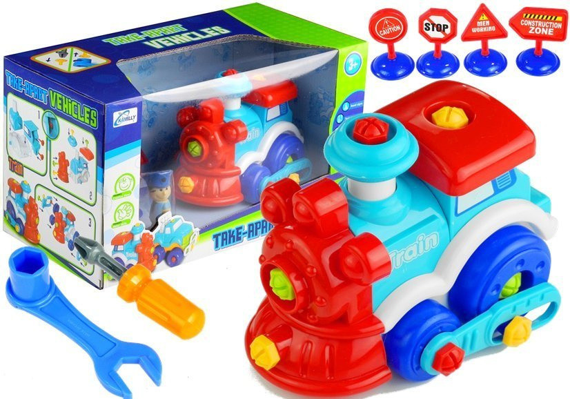 Levehető vonatfutó figurák Ez a vidám, többszínű csucsi-csu nagyszerű szórakozást nyújt minden moduláris játékokat kedvelő kisgyermek számára. Az érdekes színek és formák pozitívan hatnak a látás és a tapintás érzékére, míg a játék elemeinek szétszerelésének lehetősége fejleszti a gyermek kézügyességét és motoros készségeit, bővítve képzelőerejét. A vonat mozgatható kerekekkel rendelkezik, így gyermeke a padlón, szőnyegen vagy más felületeken játszhat vele. Ami fontos, a készlet nemcsak a vonatot tartalmazza, hanem figurákat is, amelyek érdekesebbé teszik a játékot, valamint műanyag eszközöket is. Az állítható villáskulcs és a cserélhető hegyű csavarhúzó tökéletesen illeszkedik a műanyag csavarok méretéhez, amelyekkel a játék kerekei vagy lökhárítói rögzítve vannak. Érdemes megjegyezni a megoldás számos lehetőségét. Mostantól a játék nem egy szerves egész - a gyermek szétszerelheti és a saját szabályai szerint játszhat vele. A bemutatott jármű kiváló minőségű műanyagból készült. CE tanúsítvánnyal rendelkezik, ami biztonságossá teszi a termék használatát. Ennek a játéknak az előnye nemcsak az első osztályú, figyelemfelkeltő dizájnja és meleg színei, hanem a játék sokszori szétszerelésének és elcsavarásának lehetősége is. A kisgyermekeknek szánt készlet a következőket tartalmazza: - többszínű vonat, - kalauz figura, - szerszámok: állítható villáskulcs és cserélhető hegyű csavarhúzó, - közlekedési táblák és bóják.   A készlet elemeinek méretei: - vonat: 17,5 cm x 13 cm x 13 cm, - kalauz: 7 cm - állítható villáskulcs: 12,5 cm x 3,5 cm   Csomagolás méretei: - 33 cm x 16,5 cm x 18 cm A játék esztétikus, színes dobozban, vitrinben található. A doboz oldalán egy használati utasítás található, amely részletesen bemutatja a játék megfelelő összeszerelését. A színes vonat minden 3 év feletti gyermek számára készült, akik számára a játék összeszerelésének nehézségi szintje testreszabott.