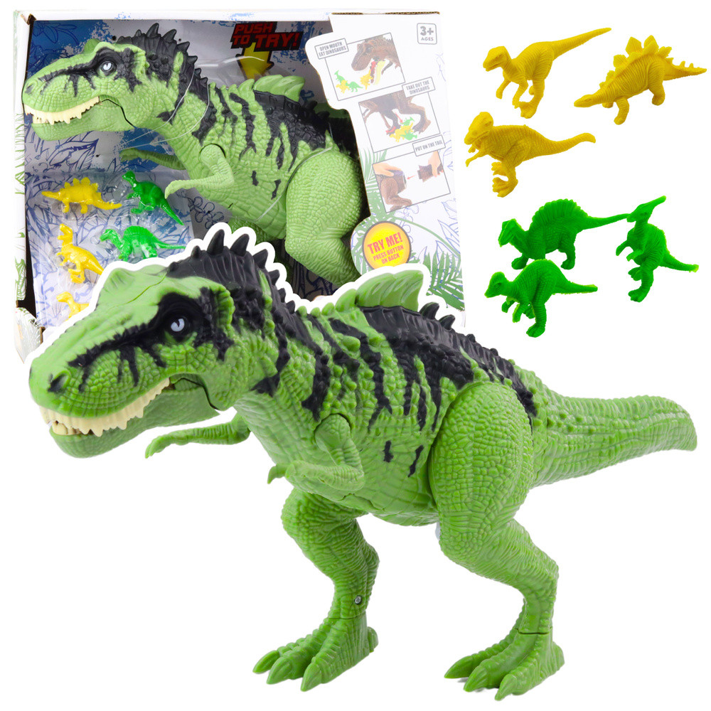 HANGOS DINÓ MINI DINÓ KÉSZLET A hanghatással rendelkező dinoszaurusz egy egyedi játék, amely elrepíti a gyerekeket az ősi lények lenyűgöző világába. Egy nagy ragadozó realisztikus figurája, amelyet nagy odafigyeléssel készítettek, mind megjelenésével, mind funkcionalitásával elbűvöli a gyerekeket. A bőr textúrája, a sziluett hű reprodukciója és a dinamikus színezés a zöld árnyalatokban, fekete részletekkel lenyűgözővé teszi a játékot, és már első pillantásra felkelti az érdeklődést. A gyermek a készletben található kisebb dinoszauruszokat a nagy figura szájába helyezheti, majd a játék alján található speciális nyíláson keresztül kiveheti őket. A hátulján található gomb megnyomása után a játék realisztikus üvöltést hallat, ami tovább fokozza a játék iránti rajongást, és még jobban átélheti az őskori hangulatot. A dinoszaurusz mozgatható végtagokkal és farokkal rendelkezik, amelyek lehetővé teszik, hogy szabadon beállítsa különböző pózokba. A készlet öt színes, kis dinoszaurusz figurát is tartalmaz, amelyek változatossá teszik a játékot, és lehetővé teszik, hogy saját forgatókönyveket és dino világokat alkosson. Ez egy kiváló játék, amely támogatja a kreativitás és a kézügyesség fejlesztését. Az egész egy esztétikus csomagolásban található, a dinoszauruszok világára utaló grafikákkal, így ideális ajándéknak. SPECIFIKÁCIÓ: A dinoszaurusz méretei: 43,5 x 22 x 11 cm A csomag méretei: 32 x 26,5 x 14 cm Tápegység: 3x AG13 (tartozék) Anyag: műanyag (kiváló minőségű műanyag) Hangfunkció: mechanikus, a hátulján található gombbal aktiválható Mozgatható elemek: végtagok, farok Alkalmazás: tematikus szórakozás, a képzelet és a motoros koordináció fejlesztése A SZETT TARTALMA: Egy nagy dinoszaurusz hanghatással 6 mini dinoszaurusz figura Színes csomagolás