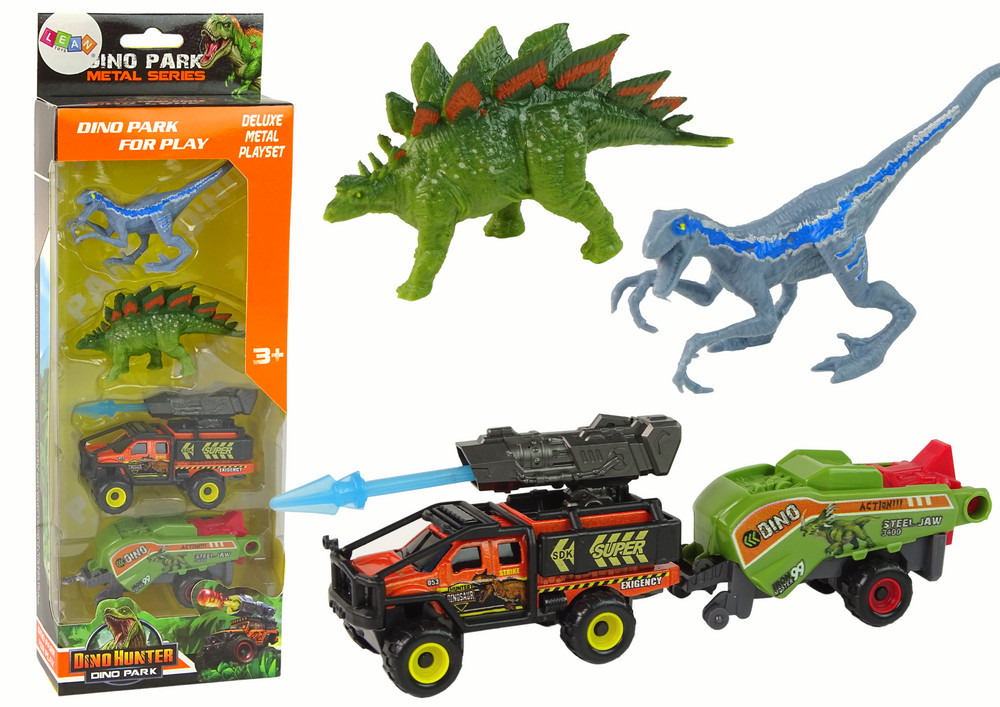 Dinoszaurusz készlet Auto Rocket Orange Semi Trailer   Ez a játékkészlet az őskor lenyűgöző világába repít minket, ahol felfedezhetjük és tanulmányozhatjuk a dinoszauruszokat. Két lenyűgöző dinoszauruszból és egy futurisztikus terepjáróból áll, amely hihetetlen szórakozást és rengeteg kalandlehetőséget kínál. A Velociraptor kékesbarna bőrű. Ez egy rendkívül realisztikus megjelenésű és ragadozó hüllő. Teste kék, bőre sötétkék csíkokkal rendelkezik, ami hiteles megjelenést kölcsönöz neki. A Stegosaurus zöld bőrű és narancssárga sörényű. Lenyűgöző ragadozó dinoszaurusz. Teste zöld, jellegzetes vonása a hátán lévő narancssárga sörény, ami egyedi bájt kölcsönöz neki. Hosszú farka van, ami ragadozó megjelenést kölcsönöz neki, és kiemeli őskori jellegét. A jármű tetején egy mozgatható rakétával ellátott rakétavető található. A dinoszauruszok a jármű belsejéből követhetők és tanulmányozhatók, így tökéletes eszköz az őskori világba tett expedíciókhoz. A jármű tetején található rakétavető egy nyíllal van felszerelve, amelyet dinoszauruszok vadászatára használnak. Ez az innovatív funkció akció- és kalandelemet ad a játékhoz, lehetővé téve, hogy úgy tegyél, mintha dinoszauruszokra vadásznál. Az autóhoz egy utánfutó is tartozik, amely tökéletesen kiegészíti a készletet, és lehetővé teszi a befogott dinoszauruszok szállítását.   A készlet tartalma: - Két dinoszaurusz - Rakétás jármű - Eredeti csomagolás - Utánfutó ketrecben   Velociraptor méretei: 10 cm x 4 cm   Stegosaurus méretei: 9 cm x 4,5 cm   Jármű méretei: 9 cm x 6 cm x 5 cm   Utánfutó méretei: 10 cm x 4 cm x 4 cm   A csomag mérete: 32 cm x 11 cm x 5,5 cm   CE tanúsítvánnyal rendelkezik és megfelel az EN71 szabványnak. A játék 3 év feletti gyermekek számára készült.