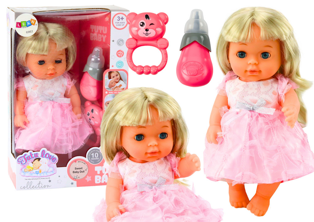 Világosrózsaszín Ruhás Baba Pisilős Palack Csörgő Hangjai Egy bájos baba világosrózsaszín ruhában, bájos csipkével díszítve, amely biztosan minden gyermek kedvenc játékává válik. Vidám és örömteli megjelenése szórakozásra ösztönöz, a színes pöttyös ruha pedig egyedi bájt kölcsönöz neki. A babának hosszú, világos haja van, amely fésülhető, különféle frizurákba formázható és kiegészítőkkel díszíthető. A baba rendkívül funkcionális a mozgatható karjainak, lábainak és fejének köszönhetően. Ezek a mozgatható elemek lehetővé teszik, hogy a babát különböző pozíciókba helyezzük, ami még realisztikusabbá teszi a játékot. Amikor letesszük a babát, a szemei ​​automatikusan becsukódnak, ami utánozza a baba alvását, és realizmust ad a játék során. A készlet tartalmaz egy speciális palackot, amely vízzel tölthető. Amikor a gyermek vízzel eteti a babát, a baba pisilni tud, ami hitelességet kölcsönöz a babának, és lehetővé teszi a gyerekek számára, hogy átérezzék a gondozó szerepét. A baba etetésével és pelenkázásával való játék felelősséget és mások iránti gondoskodást tanít. A baba hasán egy hangszóró található. Csak nyomj meg egy gombot, hogy különböző hangokat hallj, ami még érdekesebbé teszi a mókát. A baba olyan hangokat ad ki, amelyekkel utánozhatja a baba különböző érzelmeit és viselkedését, ami serkenti a gyermek képzeletét és fejleszti hallását és kognitív képességeit. Ezenkívül a készlet tartalmaz egy csörgőt is, ami tökéletes kiegészítője a mókának. A csörgő nemcsak szórakoztat, hanem segít fejleszteni a gyermek motoros készségeit és motoros koordinációját is. Ez a baba tökéletes választás minden olyan gyermek számára, aki szereti a játékaival foglalkozni, és igazi szülőnek akarja érezni magát. A baba méretei: 28cm x 14cm x 9cm A csomag mérete: 32,5cm x 20,5cm x 10,5cm CE tanúsítvánnyal rendelkezik és megfelel az EN71 szabványnak. 3 év feletti gyermekek számára készült.