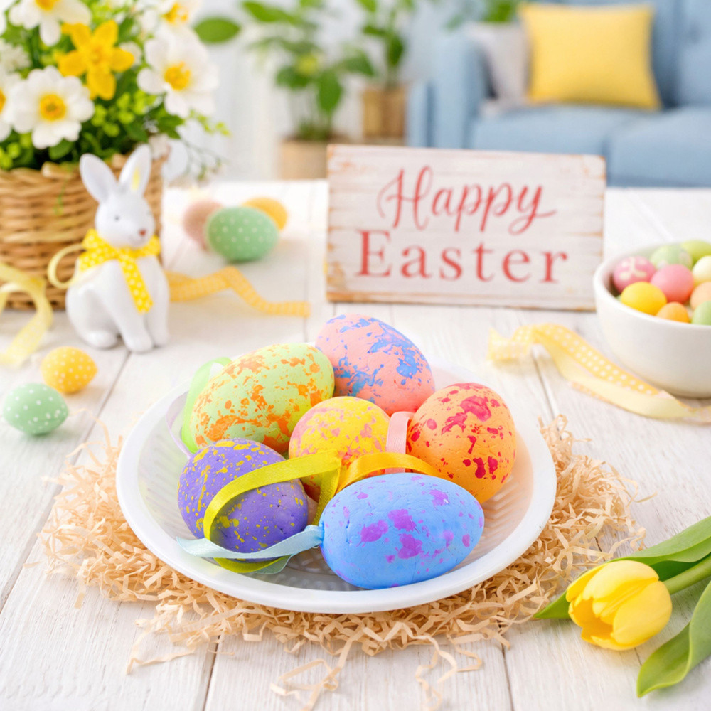 HÚSVÉTI TOJÁSOK KARICSOKKAL 6 DB Ez a díszes húsvéti tojáskészlet tökéletes módja annak, hogy ünnepi és tavaszi hangulatot teremtsen otthonában, irodájában vagy kertjében. A felületen lévő színes foltoknak köszönhetően a tojások egyedi megjelenést kölcsönöznek, amely tökéletesen illik a húsvéti dekorációkhoz. A pasztellszínek elegánssá és visszafogottá teszik a dekorációt, meleg és vidám hangulatot kölcsönözve a belső térnek. A tojások praktikus karikák segítségével könnyen felakaszthatók gallyakra, díszekre, húsvéti kosarakra, koszorúkra vagy ablakdíszekre. Ennek köszönhetően sokféleképpen felhasználhatók, a dekorációt a saját preferenciáihoz és elrendezési ötleteihez igazítva. A termék könnyű polisztirolból készült, ami biztosítja a sérülésekkel szembeni ellenállást, és azt jelenti, hogy a tojások sokszor felhasználhatók. Tökéletesen működnek húsvéti asztaldíszként, ünnepi dekorációként, valamint nagyobb otthoni vagy kerti kompozíciók elemeként. SPECIFIKÁCIÓ: Tojás anyaga: Hungarocell - könnyű, tartós és sérülésálló Tojás színei: Kék, sárga, zöld, narancssárga, lila, rózsaszín - pasztell árnyalatok foltos hatással Fül: Igen - lehetővé teszi a dekorációk egyszerű felakasztását Alkalmazás: Asztali dekoráció, koszorúk, húsvéti kosarak, ágak, koszorúk, girlandok és ablakdíszek díszítésére A KÉSZLET TARTALMA: 6 db pasztell színű, foltos hatással és füzérekkel ellátott hungarocell tojás Védőcsomagolás