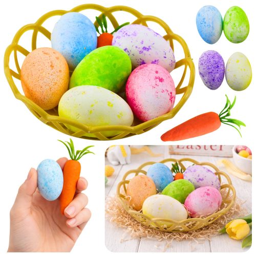 Húsvéti díszek kosárban tojások sárgarépa színes 7db