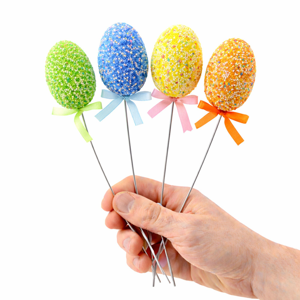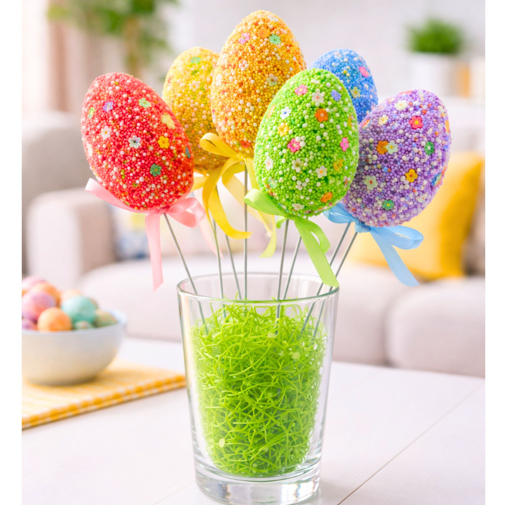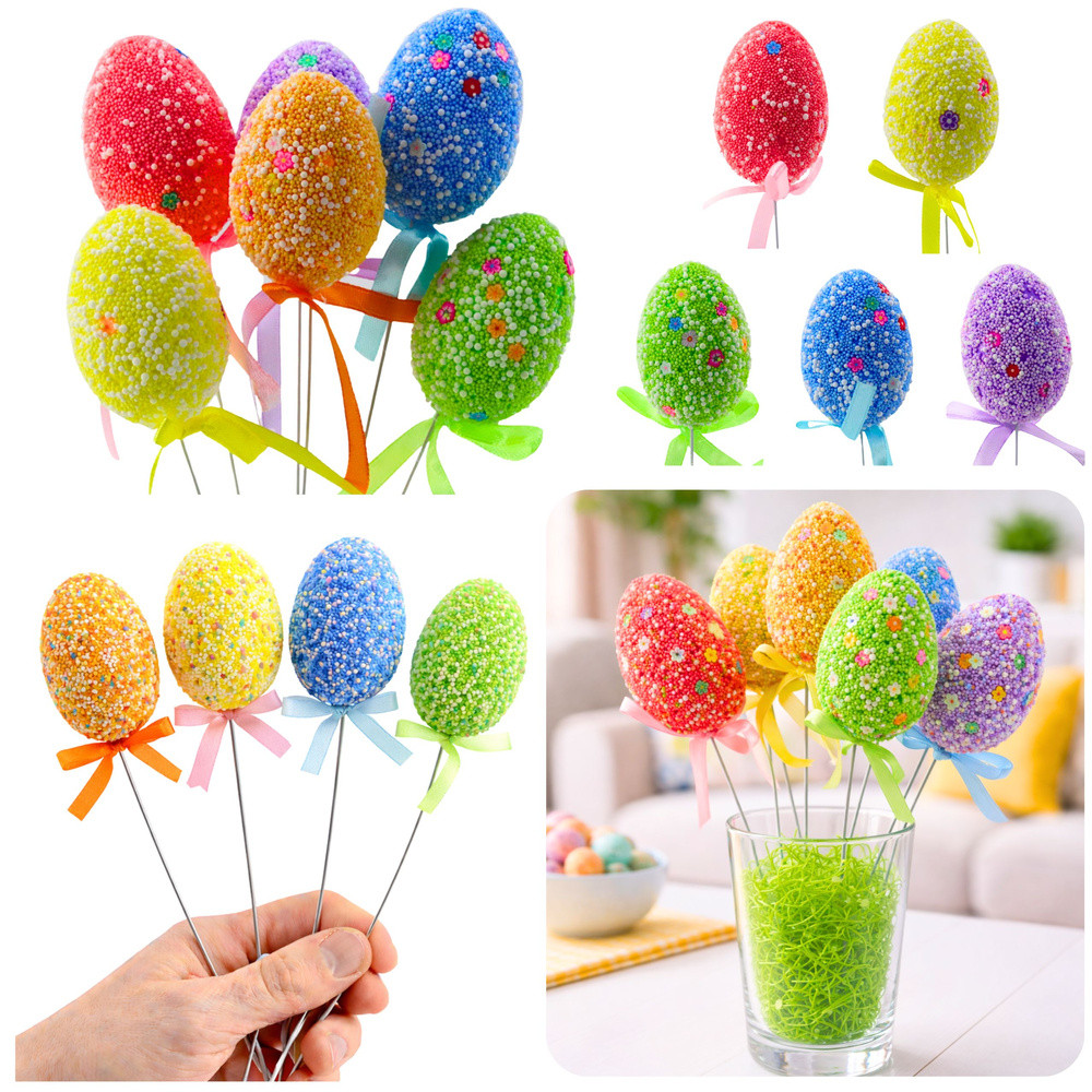 HÚSVÉTI TOJÁSOK DRÓTON FEHÉR POLISZTIROL GOLYÓKKAL ÉS MINTÁKKAL - 6 DB A dróton lévő húsvéti tojások tökéletes módja annak, hogy otthonod húsvéti dekorációját élvezhesd. Minden tojás gondosan díszített polisztirol golyókkal és apró mintákkal, egyedi karaktert kölcsönözve nekik. A színes pasztellszínű tojások tökéletesek a tavaszi hangulathoz. A tojás színéhez illő szalag extra elegáns és egységes megjelenést kölcsönöz a dekorációnak. Ezenkívül a rugalmas drót lehetővé teszi a tojások könnyű elhelyezését bárhol, így szabadon kiállíthatók. Ezek a tojások tökéletes díszei a húsvéti asztalnak. Finom színeikkel és húsvéti témájú dizájnjukkal kiváló választások ünnepi dekorációnak otthonodban, kertedben vagy irodádban. SPECIFIKÁCIÓ: Tojás méretei: 5 cm x 3,5 cm Dekoráció magassága: 24 cm Tojás színei: Sárga, Kék, Narancssárga, Lila, Zöld, Rózsaszín Tojás anyaga: Polisztirol Kivitel: Polisztirol golyók és minták, a tojás színével megegyező szalag További jellemzők: Rugalmas drót a dekoráció egyszerű elhelyezéséhez A SZETT TARTALMA: 6 húsvéti tojás pálcikán Minden tojás polisztirol golyókkal és mintákkal díszített Rugalmas drót a dekoráció egyszerű elhelyezéséhez