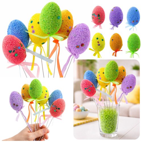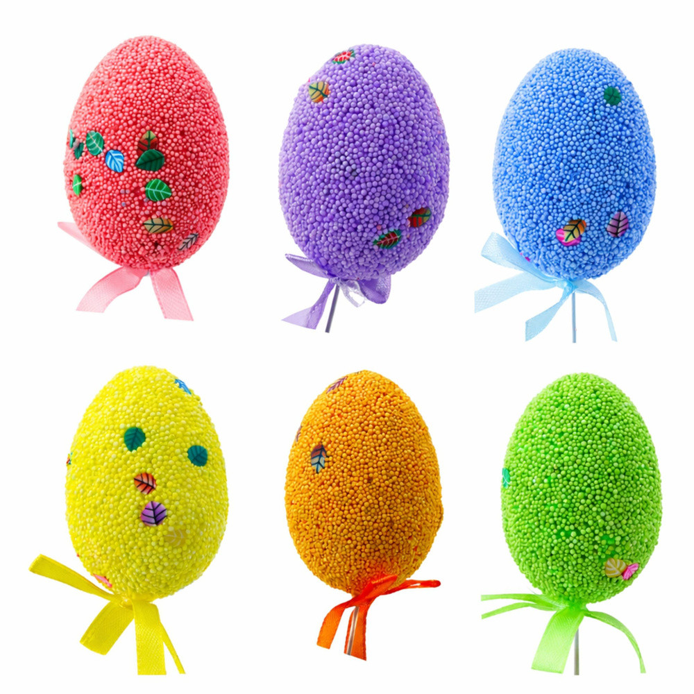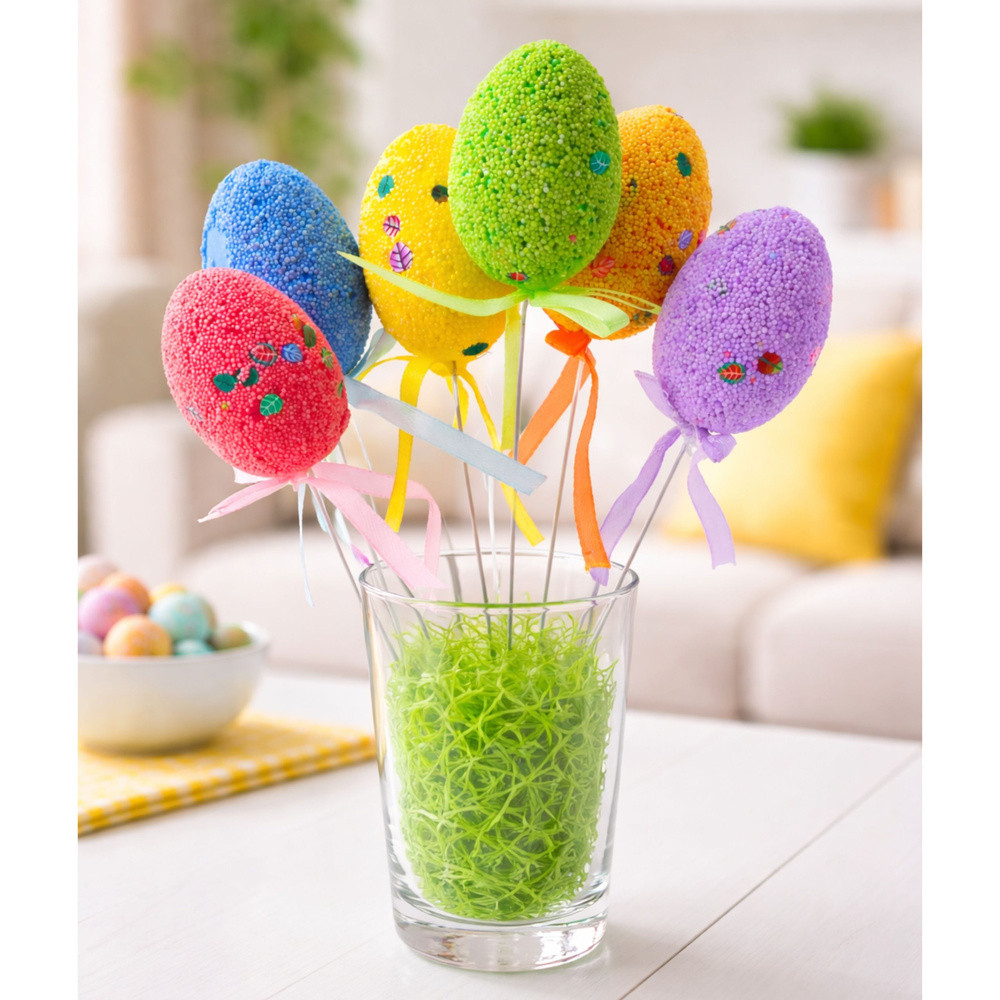 HÚSVÉTI TOJÁSOK DRÓTPÁLCÁN, SZÍNES LEVELEKKEL – 6 db-os drótra erősített húsvéti tojáskészlet nagyszerű módja annak, hogy feldíszítsd otthonod húsvétra. Minden tojást gondosan díszítettünk polisztirol golyókkal és kis levelekkel, ami egyedi karaktert kölcsönöz nekik. A pasztell árnyalatú színes tojások remekül illenek a tavaszi hangulathoz. A tojással megegyező színű szalag még elegánsabbá és koherensebbé teszi a dekorációt. Ezenkívül a rugalmas drót lehetővé teszi a tojások könnyű elhelyezését bárhol, így szabadon kiállíthatod őket. A tojások tökéletesek a húsvéti asztal díszeként. Finom színeiknek és húsvéti jellegüknek köszönhetően remek választás ünnepi dekorációnak otthonra, kertbe vagy irodába. MŰSZAKI ADATOK: Tojás méretei: 5 cm x 3,5 cm Dekoráció magassága: 24 cm Tojás színei: Sárga, Kék, Narancssárga, Lila, Zöld, Rózsaszín Tojás anyaga: Hungarocell Kivitel: Hungarocell gyöngyök és levelek, szalag a tojás színében További jellemzők: Rugalmas drót a díszek egyszerű elhelyezéséhez A SZETT TARTALMA: 6 húsvéti tojás egy pálcikán Minden tojás hungarocell gyöngyökkel és levelekkel díszített Rugalmas drót a díszek egyszerű elhelyezéséhez