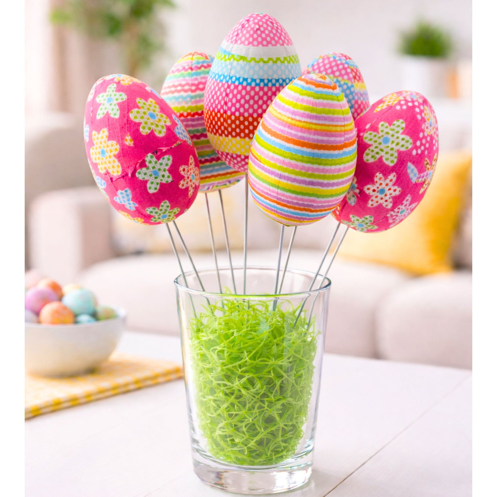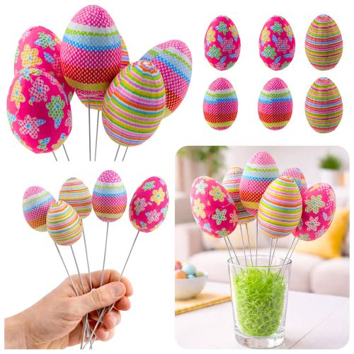 Húsvéti tojások dróton Pick Pontok Virágok Csíkok Dekoráció Színes 6db