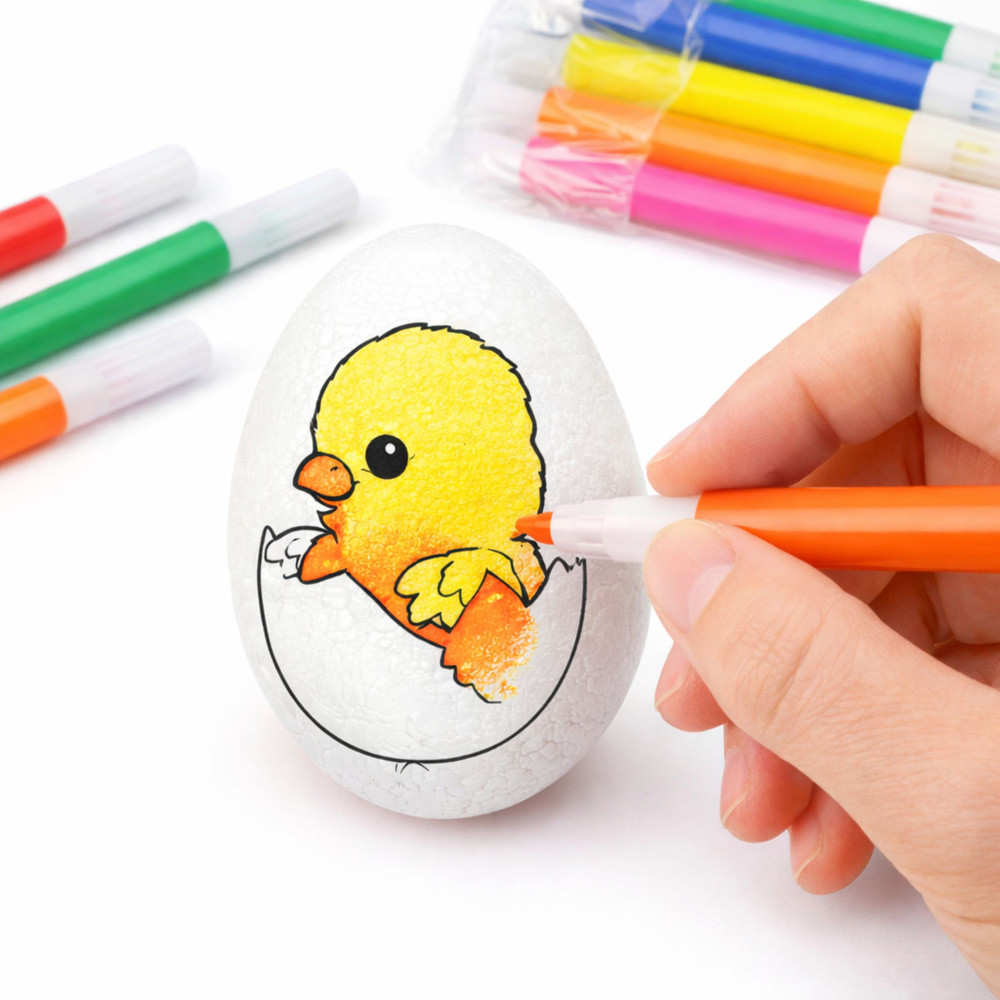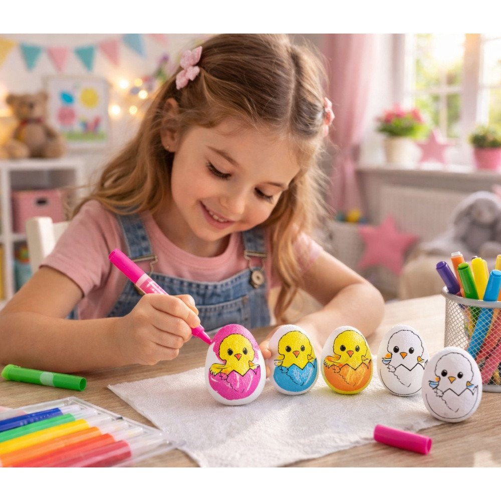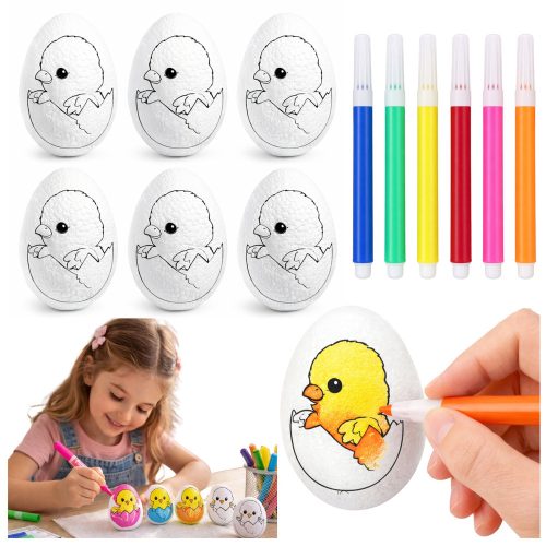 ⭐ HUNAGPOR TOJÁSOK FESTÉSHEZ – 6 DARAB FILTEREKKEL ⭐ Ez a hungarocell tojáskészlet tökéletes választás gyerekeknek festéshez. A tojások sima felületűek, így készen állnak festésre, díszítésre, aláírásra, vagy egyszerűen csak hagyományos húsvéti tojások készítésére. A készlet 6 db hungarocell tojást tartalmaz csibe a tojásban mintával és különböző színű filctollakkal, így ideális otthoni, iskolai vagy óvodai szórakozáshoz. ⭐ FŐBB TERMÉKJELLEMZŐK Tökéletes festéshez A tojások sima felülete készen áll festésre, díszítésre vagy írásra, így kreatív és oktató jellegű tevékenység a gyerekek számára. Fejleszti a motoros készségeket A tojásfestés segít a gyerekeknek a kéz-szem koordináció gyakorlásában, javítja az ügyességet és a motoros kontrollt. Serkenti a képzeletet A gyerekek saját mintákat készíthetnek, fejlesztve kreativitásukat és művészi kifejezésmódjukat. Sokoldalú felhasználás Tökéletes húsvéti dekorációkhoz, valamint művészeti és kézműves projektekhez és oktatási tevékenységekhez gyerekeknek. ⭐ MŰSZAKI ADATOK Tojás magassága: 5,5 cm Tojás szélessége: 3,5 cm A készletben található filctoll színei: Sárga, Narancssárga, Piros, Kék, Rózsaszín, Zöld Tojás anyaga: Hungarocell ⭐ A KÉSZLET TARTALMA 6 db hungarocell tojás csirke a tojásban mintával 6 db filctoll (sárga, narancssárga, piros, kék, rózsaszín, zöld) TOVÁBBI ELŐNYÖK Vonzó dizájn A hungarocell tojások sima, fehér felülete tökéletessé teszi őket a személyre szabáshoz és saját elképzelések szerinti díszítéshez. Gyermekek számára biztonságos Hungarocell tojásaink minden biztonsági szabványnak megfelelnek, így ideálisak a gyermekek játékához és kreativitásához. Tartós és könnyen használható A hungarocell anyag könnyű, tartós és könnyen kezelhető, így biztonságos és élvezetes festési élményt biztosít. Nagyszerű ajándékötlet Ez a készlet tökéletes húsvéti ajándék vagy egy oktató jellegű kézműves készlet, amely minden gyermeknek örömet okoz.