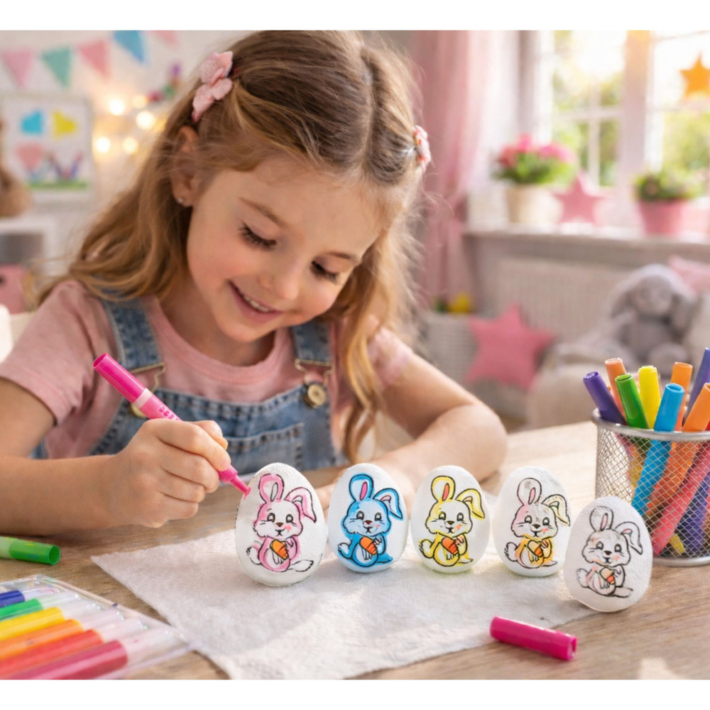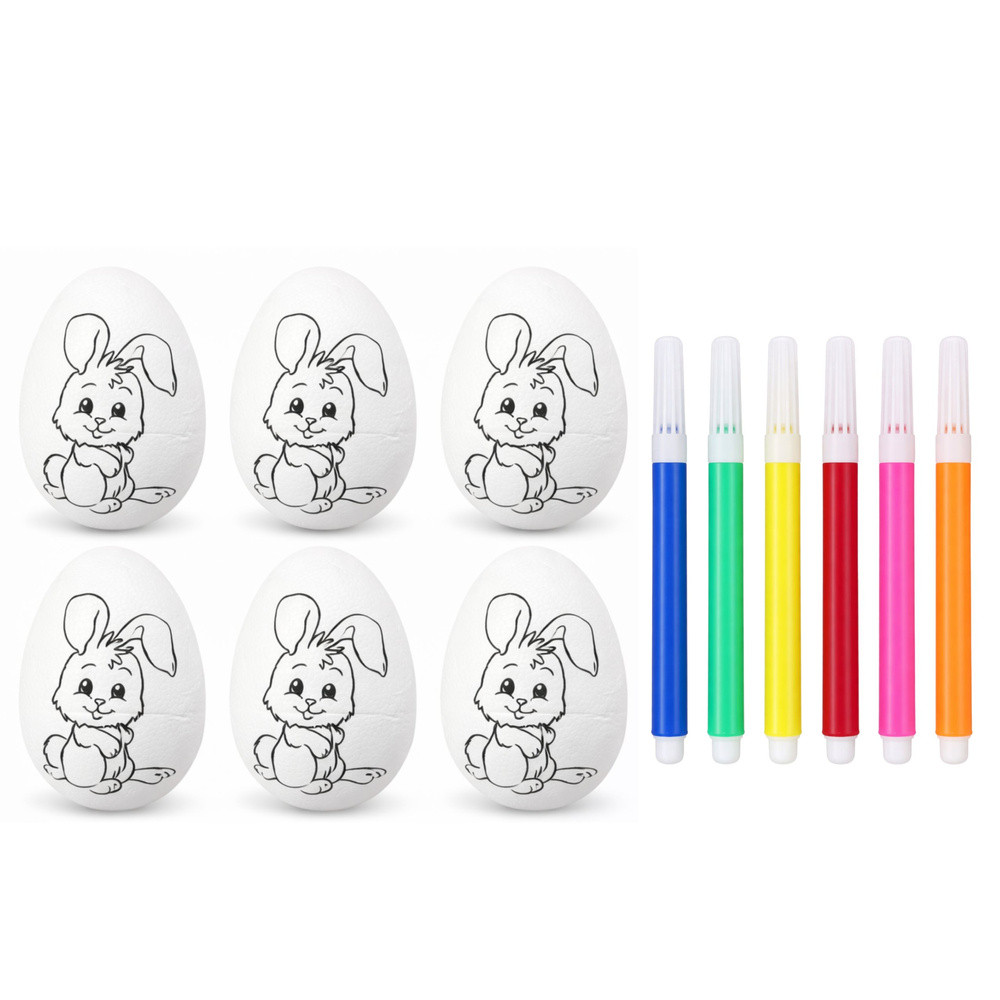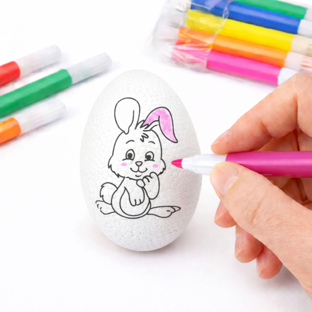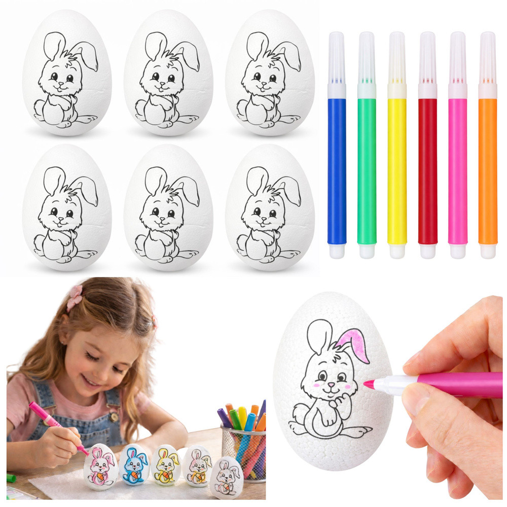 ⭐  POLISZTIROL TOJÁSOK FESTÉSHEZ – 6 DARAB FILTEREKKEL  ⭐ Ez a polisztirol tojáskészlet tökéletes választás gyerekeknek festéshez. A tojások sima felületűek, így készen állnak festésre, díszítésre, írásra, vagy egyszerűen csak a hagyományos húsvéti tojások készítésére. Ezenkívül minden tojás egy aranyos nyuszi mintával rendelkezik, így a tevékenység még szórakoztatóbb! A készlet 6 polisztirol tojást és filctollokat tartalmaz különböző színekben, így ideális otthoni, iskolai vagy óvodai játékhoz. ⭐  FŐBB TERMÉKJELLEMZŐK   Tökéletes festéshez A tojások sima felülete készen áll festésre, díszítésre vagy írásra, így kreatív és oktató jellegű tevékenység a gyerekek számára.   Fejleszti a motoros készségeket A tojások festése segít a gyerekeknek a kéz-szem koordináció gyakorlásában, javítja a kézügyességet és a motoros kontrollt.   Serkenti a képzeletet A gyerekek a tojásokat felhasználhatják saját minták elkészítésére, elősegítve a kreativitást és a művészi kifejezést.   Sokoldalú felhasználás Ideális húsvéti dekorációkhoz, valamint művészeti projektekhez és oktató jellegű játékokhoz gyerekeknek. ⭐  SPECIFIKÁCIÓK Tojás magassága:  5,5 cm Tojás szélessége:  3,5 cm Tartalmazott filctoll színek:  Sárga, Narancssárga, Piros, Kék, Rózsaszín, Zöld Tojás anyaga:  Polisztirol ⭐  KÉSZLET TARTALMA 6 db nyuszi mintás polisztirol tojás 6 db nyuszi mintás filctoll (sárga, narancssárga, piros, kék, rózsaszín, zöld) TOVÁBBI ELŐNYÖK   Vonzó dizájn A polisztirol tojások sima, fehér felülete és bájos nyuszi mintája tökéletessé teszi őket a személyre szabáshoz és az egyéni elképzelések szerinti díszítéshez.   Gyermekek számára biztonságos Polisztirol tojásaink minden biztonsági szabványnak megfelelnek, így ideálisak a gyermekek játékához és kreativitásához.   Tartós és könnyen használható A polisztirol anyag könnyű, tartós és könnyen kezelhető, így biztonságos és élvezetes festési élményt biztosít.   Nagyszerű ajándékötlet Ez a készlet tökéletes húsvéti ajándék vagy oktatókészlet, amely minden gyermeknek örömet okoz.