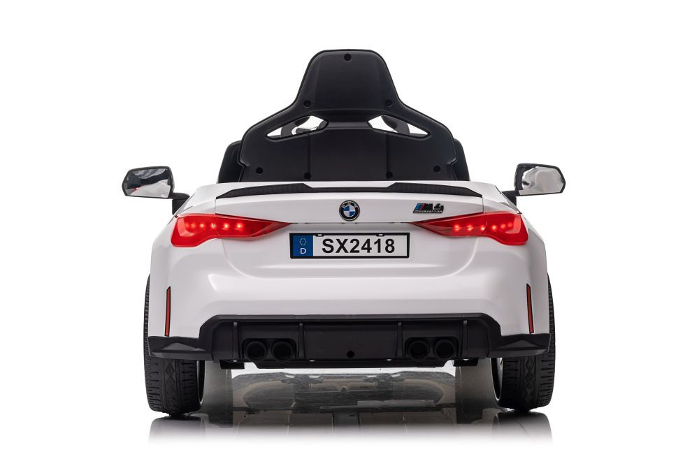 BMW M4 akkumulátoros autó fehér Csomag méretei: 112 cm x 57 cm x 29 cm Csomag súlya: 22 kg
