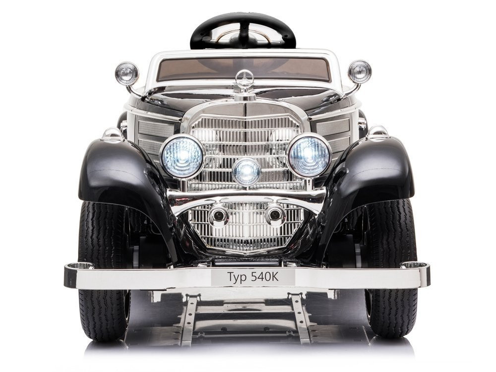 Retro Mercedes 540K A Mercedes-Benz 540K egy felsőkategóriás prémium autó. Mindenekelőtt futurisztikus karosszériavonala és rendkívül gondosan kidolgozott, minden részletre odafigyelő kidolgozása jellemzi. A stílusos veterán kétajtós kupé karosszériával rendelkezik, amely egy széles, könnyű, puha öko-bőrből készült üléssort foglal magában. Mi teszi a Mercedes-Benz 540K-t ilyen népszerűvé? Tudj meg többet róla, és te vagy az, amiről beszélünk:- eredeti Mercedes-Benz licenc,- a vintage veteránokra jellemző dizájn,- a klasszikus Mercedes 540K ihlette belső tér,- króm elemek és egy diófára emlékeztető fényes tábla,- a játékbiztonságot növelő LED-es lámpák,- a csomagtartó fedelének nyitása,- lassú indítás funkció,- a legmagasabb minőségű alkatrészek. A Mercedes belsejében az akkumulátorhoz olyan elemek találhatók, amelyek zavaróan hasonlítanak a felnőtteknek szánt standard járműmodell felszereltségéhez. A krémszínű műszerfalon található egy járműkapcsoló, valamint egy memóriakártya-nyíláshoz csatlakoztatott zenelejátszó, valamint USB és MP3 port. Ezen elemek között egy ergonomikus formájú kormánykerék található. A jármű nagy előnye a kisgyermek biztonságáért felelős öv, valamint a nyitható csomagtérajtó, amelyen a márka logója és a jármű típusa látható. Az akkumulátorral működő jármű EVA anyagból készült kerekeken van felszerelve, így különféle felületeken is vezethető. A Mercedes miniatürizált retró változata nemcsak fantasztikus megjelenésű. Az autó a "motorháztetője" alatt 4x45 W-os motort és egy 12 V-os 10 Ah-s akkumulátort rejt, aminek köszönhetően egy több éves vezető 5-7 km/h sebességgel haladhat. A készlet tartalmaz egy innovatív 2,4 G-os távirányítót, amely lehetővé teszi az autó távoli irányítását. A távirányító konstrukciója olyan gombokat tartalmaz, amelyek lehetővé teszik az irány kiválasztását: jobbra / balra, előre / hátra, valamint a sebességválasztást és a vészhelyzeti, azonnali megállás funkciót. Ennek a megoldásnak köszönhetően a Mercedes 540K-t kisebb gyermekek is használhatják, a gondozóik által irányított járműben vezetve. A retró akkumulátoros autó minden 3 év feletti gyermek számára készült. A modell CE tanúsítvánnyal rendelkezik, amely garantálja a játék biztonságos használatát. Tanúsított anyagokból készült, ami az egyszerű, éles végek és elemek nélküli szerkezettel kombinálva a magas kényelmet biztosítja a használat során. A Mercedes gyerekeknek esztétikus dobozban érkezik, amely tökéletes ajándék néhány éves gyermekek számára. Csomag méretei: 130 cm x 59 cm x 37 cm Súly csomagolással: 26,5 kg