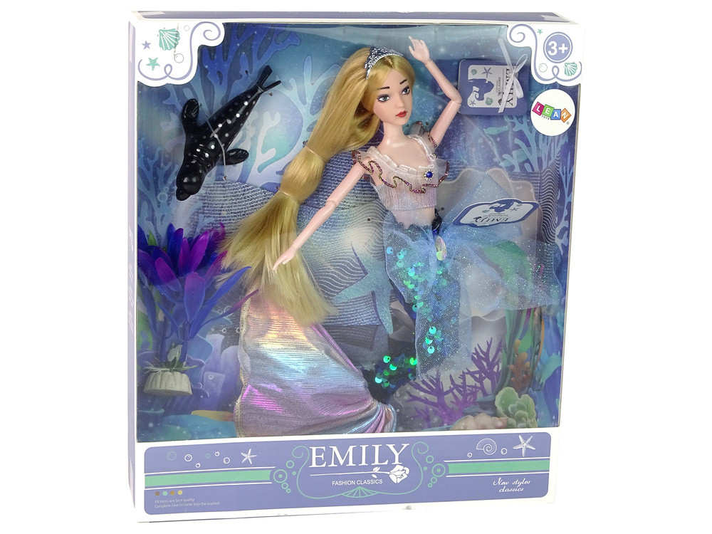 Emily sellő baba zöld kiegészítőkkel Köszöntsd Emily sellő babát, aki meghív a víz alatti kalandok varázslatos világába! Ennek az imádnivaló babának hosszú szőke haja és zöld szeme van, fején pedig egy tiara csillog, kiemelve egyediségét. Farka - zöld és lila árnyalatú csillogó flitterek fokozzák a bájt, és le is törölhető feketére, lenyűgöző hatást keltve. A meglepetések ezzel nem érnek véget - a farok is levehető, és a babával egy normál babához hasonlóan lehet játszani, ha talpra állítod. Nem csak a farok vonzza a tekintetet - egy gyönyörű, fodros blúz is hozzájárul Emily bájához és karakteréhez. Ez azonban nem a készletben található látnivalók vége. Emily sellő baba mellett egy imádnivaló fekete fókát ezüst pöttyökkel (10 cm x 4,5 cm x 5,5 cm) és egy imádnivalóan díszített lila és rózsaszín tengeri növényt (13 cm x 4 cm x 3 cm) is találsz, hogy gazdagítsd a víz alatti kalandok világát. Az Emily baba mérete 35 cm x 7 cm x 4 cm, a teljes készlet egy 33 cm x 29 cm x 7 cm-es dobozban található. Ez a tökéletes ajándék a mesetörténetek és varázslatos világok kis szerelmeseinek. Kezdje kalandját Emily, a sellő babával, és engedje szabadjára a varázslatot még ma!   Készlet elemei: - Emily baba - fekete fóka - víz alatti növény   Csomag méretei: 33 cm x 29 cm x 7 cm   EN71 szabványnak megfelelő és CE tanúsítvánnyal rendelkező játék. 3 éves kortól gyermekek számára alkalmas.