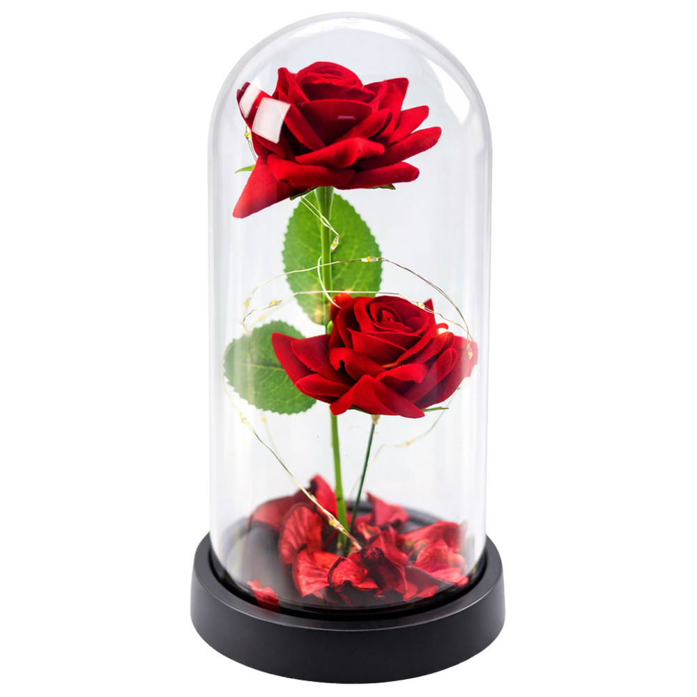 Örök 2 Rózsa Kupolában LED Világítással és Rózsaszirmokkal Piros 21x11cm