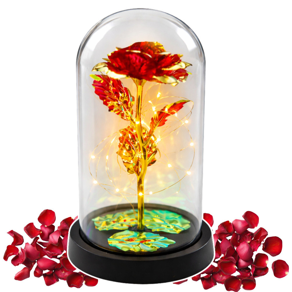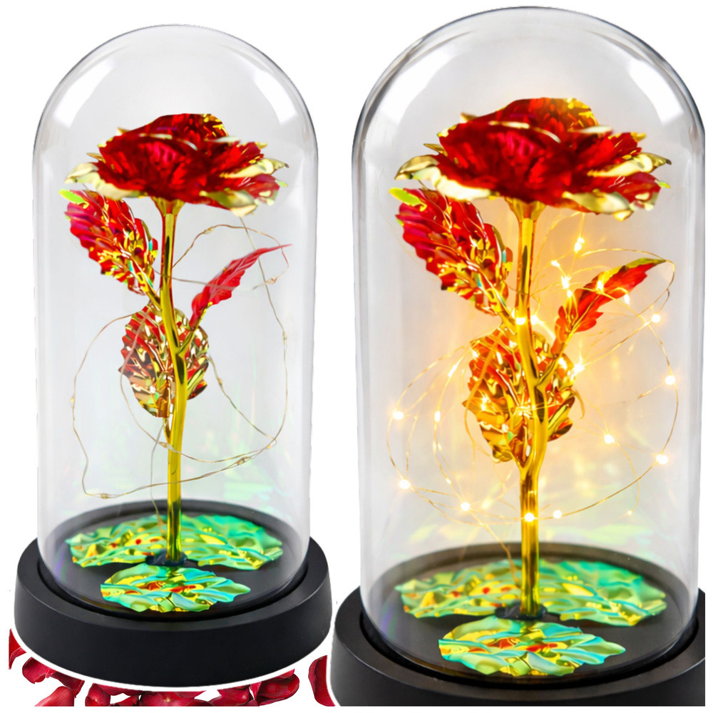 ⭐ Örök Kristályrózsa LED Kupában – Piros ⭐ Az örökrózsa üvegkupában, LED-világítással egy elegáns és szimbolikus ajándék, amely kifejezi érzéseidet, és egyedi karaktert kölcsönöz bármilyen belső térnek. A finom LED-fény alatt változó színek páratlan hangulatot teremtenek, ideális romantikus alkalmakra.⭐ A TERMÉK FŐBB JELLEMZŐI Örök Rózsa A szerelem és a vonzalom szimbóluma, amely soha nem fakul ki. A rózsa örökké megőrzi szépségét, nem igényel karbantartást. LED-világítás A finom LED-fény kiemeli a rózsa szépségét, és meleg hangulatot teremt, tökéletes belső dekorációhoz és romantikus pillanatokhoz. Kupola Elegáns borítás, amely megvédi a rózsát, és lehetővé teszi, hogy minden szögből élvezze szépségét. Műanyag talpSzilárd és stabil talp, amely biztosítja az ajándék biztonságát és esztétikus megjelenését.⭐ MŰSZAKI ADATOK️ Kupola méretei: 11 cm x 21 cm️ Áramforrás: 3 x AAA (elemek nem tartozékok)️ Rózsa anyaga: Kiváló minőségű műanyag️ Talp: Műanyag️ Világítás: 20 meleg fehér LED égő️ Csomagolás: Ajándékdoboz️ Csomagolás méretei: 22 cm x 12 cm x 12 cm️ Rózsa színe: Piros⭐ A KÉSZLET TARTALMA Örökpiros rózsa a kupolában LED lámpák Műanyag talp Ajándékdoboz⭐ TOVÁBBI ELŐNYÖK️ Egyedi dizájn – Tökéletesen kidolgozott rózsa természetes megjelenéssel, ideális belső dekorációnak.️ Szimbolizmus – Az örök rózsa a tartós szerelmet szimbolizálja, így ideális ajándék bármilyen alkalomra.️ Könnyű használat – Egyszerű be-/kikapcsolási funkció a LED lámpáknál, biztosítva a felhasználói kényelmet.️ Exkluzív minőség – A jól kidolgozott részletek és a kiváló minőségű anyagok luxus megjelenést kölcsönöznek a rózsának.