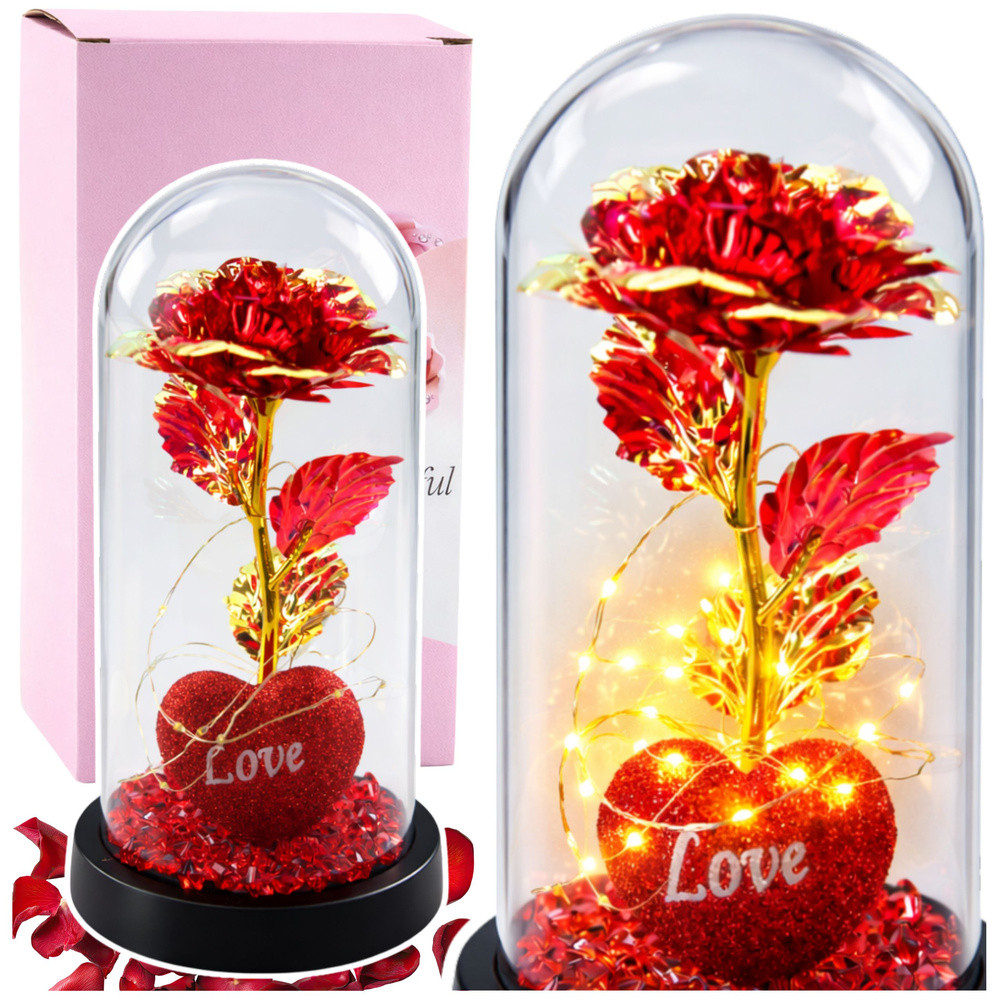 Örök Rózsa Kupolában LED Világítással Szív Gyöngyökkel Piros 21x11cm