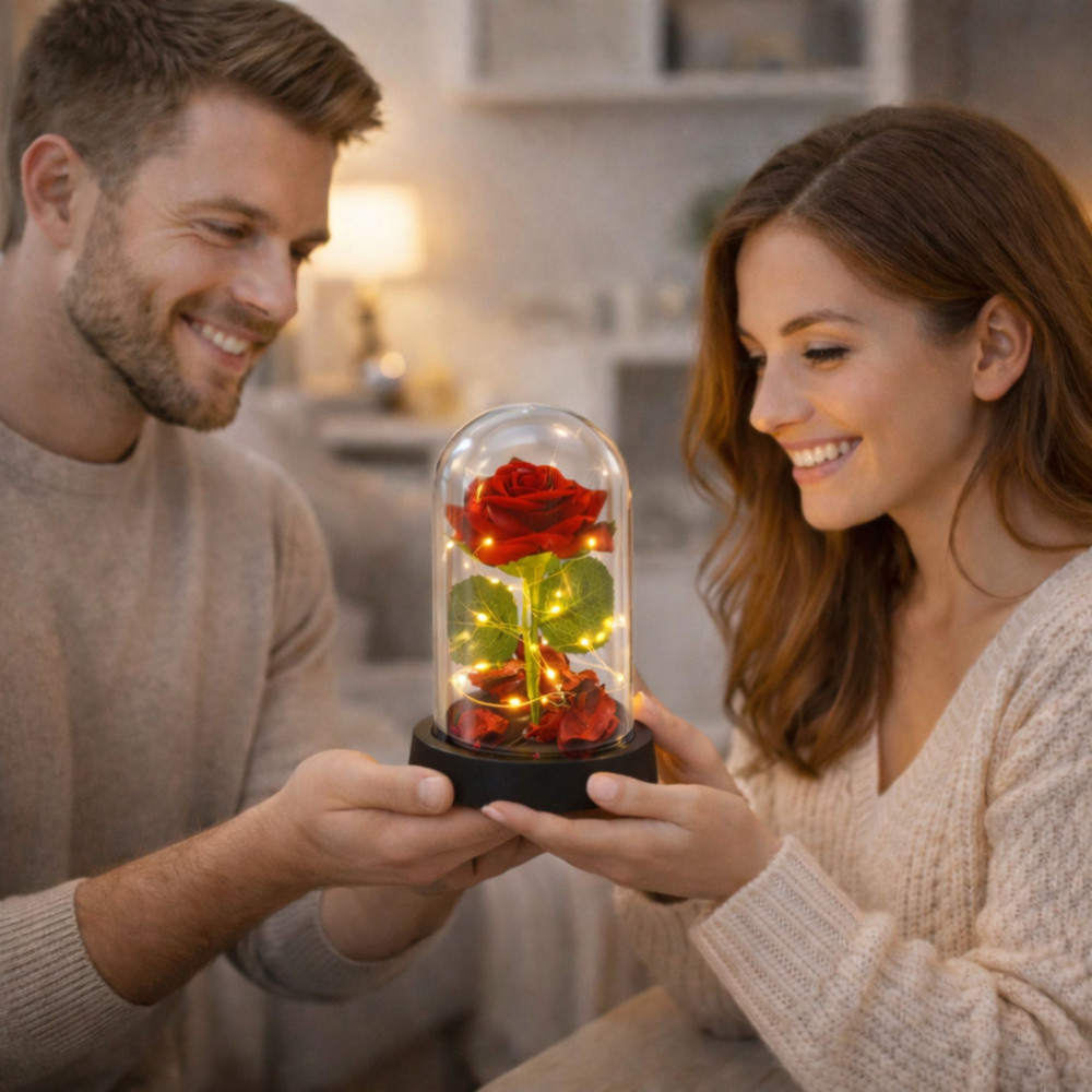 ⭐ Örökrózsa kupolában LED-világítással – Piros, rózsaszirmokkal ⭐ Az örökrózsa kupolában LED-világítással egy elegáns és szimbolikus ajándék, amely mély érzelmeket fejez ki, és egyedi hangulatot kölcsönöz bármilyen belső térnek. A LED-lámpák és a finom rózsaszirmok lágy fénye alatt varázslatos hangulatot teremt, tökéletes romantikus alkalmakra.⭐ FŐBB JELLEMZŐK Örökrózsa – A szerelem és a vonzalom szimbóluma, amely soha nem hervad el. A rózsa örökké megőrzi hibátlan szépségét, nem igényel karbantartást. LED-világítás – A gyengéd LED-fény kiemeli a rózsa finomságát és meghitt hangulatot teremt, ideális otthoni dekorációhoz és romantikus pillanatokhoz. Elegáns kupola – Az átlátszó burkolat megvédi a rózsát a portól, miközben minden szögből bemutatja szépségét. Stílusos talp – A masszív és stabil talp esztétikus megjelenést és az ajándék biztonságát biztosítja.⭐ MŰSZAKI ADATOK️ Kupola méretei: 14 cm x 8 cm️ Csomag méretei: 15 cm x 9 cm x 9 cm️ Tápellátás: 3 x LR1130 elem (tartozék)️ Rózsa anyaga: Kiváló minőségű műszálas anyag️ Talp: Műanyag️ Világítás: 10 meleg fehér LED égő️ Csomagolás: Elegáns ajándékdoboz⭐ A SZETT TARTALMAZZA: Örökpiros rózsa kupolában LED égők Műanyag talp Ajándékdoboz⭐ TOVÁBBI ELŐNYÖK️ Egyedi dizájn – Tökéletesen kidolgozott rózsa természetes megjelenéssel, ideális belső dekorációnak.️ Szimbolizmus – Az örök rózsa az örök szerelmet jelképezi, így tökéletes ajándék bármilyen alkalomra.️ Könnyű használat – Egyszerű LED be/ki funkció a kényelmes kezelés érdekében.️ Prémium minőség – A kifinomult részletek és a kiváló minőségű anyagok luxus megjelenést kölcsönöznek a rózsának.