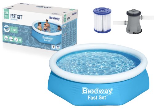 Bővíthető medence 244 x 61 cm Bestway 57450 Ha tökéletes medencére van szüksége, amelynek felállítása nem vesz igénybe sok időt, akkor ez a termék pont Önnek való. Ez a medence néhány perc alatt kibontható, csak a felső gyűrűt kell felfújni, a medence teste egy betéttel rendelkezik, amely kiemelkedik, amikor a medence megtelik vízzel. Megőrzi a stabilitását, így teljesen biztonságos a gyermekek számára. A szezon vége után könnyen és gyorsan összeszerelheti a medencét, mivel áramlásszabályozóval ellátott leeresztő szeleppel van felszerelve, amely lehetővé teszi a víz gyors leeresztését. A medence tartós anyagból készült, szúrásálló bevonattal, amelynek köszönhetően évekig szolgál. A héjak között nejlonhálós megerősítéssel és egy háromrétegű anyaggal is rendelkezik. A készlet tartalma: - Táguló medence - Szivattyú - I. típusú szivattyúszűrő - Javítófolt Műszaki adatok: - méretek 244 cm x 61 cm - Űrtartalom 1880 liter - szivattyú tápellátás 220-240V - Szivattyú teljesítménye 1249 liter/h - 3 rétegű PVC anyag   Tömeg: 8 kg Csomag mérete: 57 cm x 29 cm x 30 cm