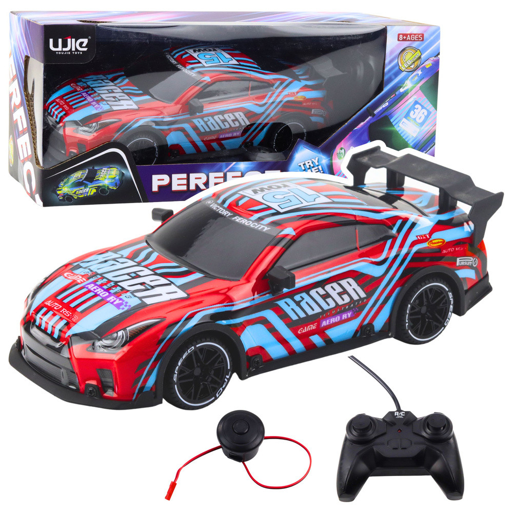 Távirányítású RC versenyautó világító kék és piros karosszériával.
