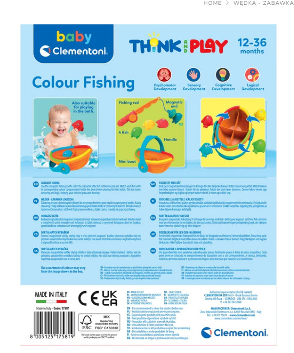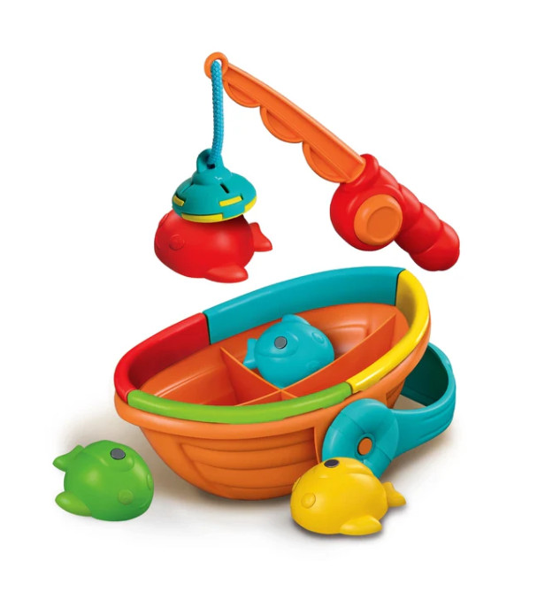 Clementoni 17581 - Horgászbot játék csónakkal és hallal Négy vidám halat kell kifogni és a színük szerint a csónakba helyezni! Egy klasszikus játék egyszerű és szórakoztató változatban, tökéletes a nagyon kisgyermekek számára. Segít a koordináció fejlesztésében és a logikus gondolkodás gyakorlásában. A játék kifinomult dizájnnal és lágy színekkel rendelkezik. Újrahasznosított műanyagból készült, teljes mértékben összhangban a Play For Future filozófiájával. A mágneses zsinórral ellátott horgászbot könnyen és azonnal használható. A készlet 4 halat tartalmaz, amelyeket a megfelelő színű rekeszhez kell párosítani. A doboz úszó csónakként is szolgál, amellyel a gyerekek fürdés közben játszhatnak. Ajánlott életkor: 12–36 hónapos Doboz méretei: 24 cm x 19,5 cm x 11,5 cm Szükséges elemek: NINCS