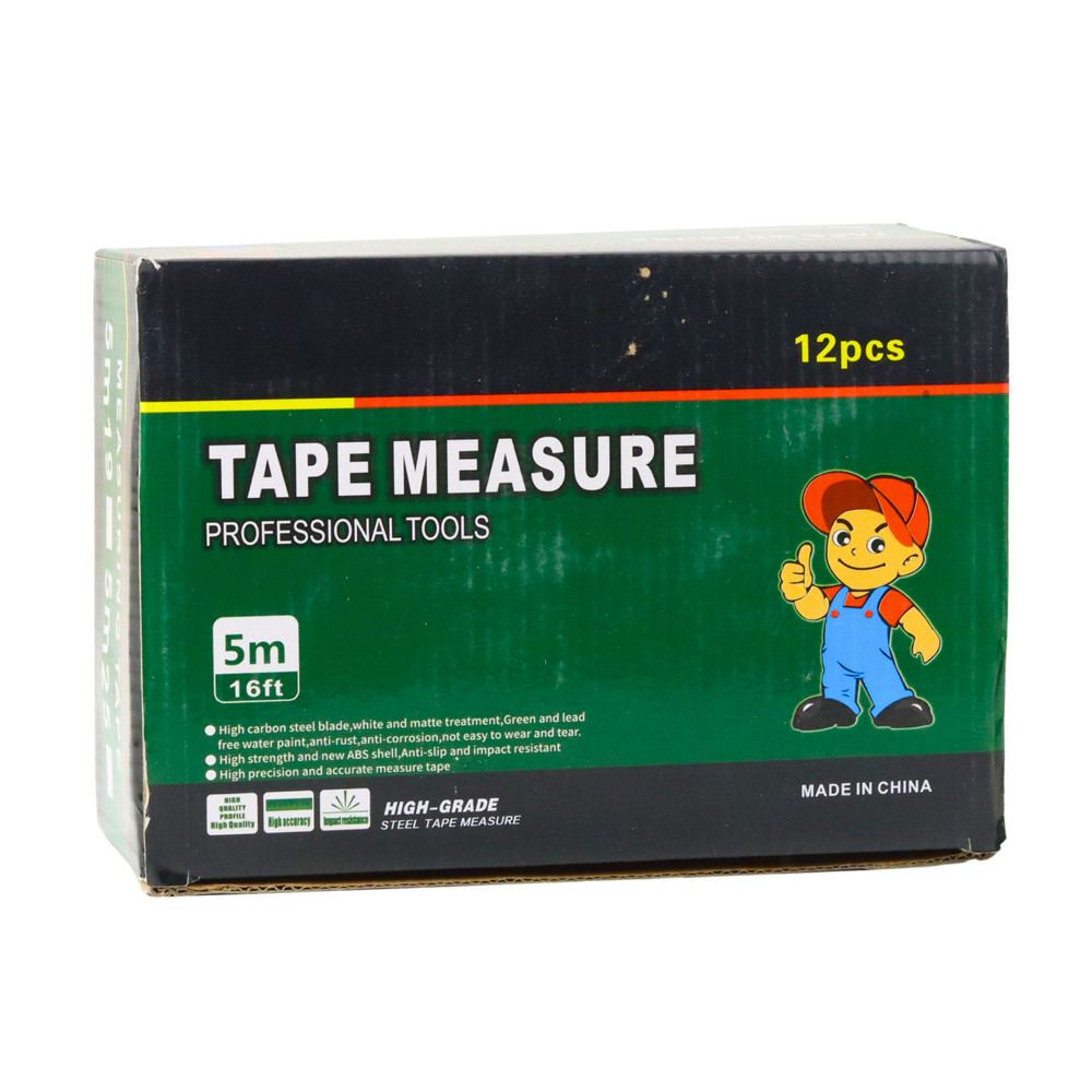 5M 25MM FLUORESZCENT SZALAGEz az 5 méter hosszú, 25 mm széles szalagos mérőeszköz praktikus és robusztus mérőeszköz mindennapi használatra otthon, műhelyben, garázsban, valamint felújítási és szerelési munkák során. A könnyű használatra és a nagy mérési pontosságra tervezett, könnyen leolvasható skála fluoreszkáló nyomtatással lehetővé teszi a könnyű leolvasást még gyenge fényviszonyok mellett is, jelentősen növelve a munka kényelmét. A mérőszalag háza tartós műanyagból készült, amely hatékonyan védi a belső mechanizmust a mechanikai sérülésektől. A mérőszalag kiváló minőségű szénacélból készült, ami biztosítja a hajlítással és kopással szembeni ellenállását, és hosszú élettartamot biztosít. A visszahúzó mechanizmus simán és hatékonyan működik, lehetővé téve a szalag gyors és biztonságos visszahúzását a mérés befejezése után. A termék további előnyei közé tartozik a speciális védőbevonat, amely növeli a nyomtatás kopásállóságát, valamint a fémhorog, amely megkönnyíti a mérőszalag biztonságos rögzítését a mért tárgy széléhez. Az ergonomikus rögzítőgomb lehetővé teszi a mérőszalag leállítását a kiválasztott hosszúságon, így a pontos mérések sokkal könnyebbek. Ez a mérőszalag egyszerű háztartási feladatokhoz és igényesebb műszaki alkalmazásokhoz egyaránt alkalmas. A nagy kiszerelés 12 darabot tartalmaz. Külön kapható. SPECIFIKÁCIÓK: Terméktípus: Tekercses mérőszalag Szalaghossz: 5 m Szalagszélesség: 25 mm Szalag anyaga: Szénacél Szalagbevonat: Fluoreszkáló védőfólia Mérési skála: Átlátszó, kontrasztos Visszahúzó mechanizmus: Automatikus Szalagzár: Igen Ház: Műanyag Akasztó: Fém Színek: Átlátszó ház zöld elemekkel Alkalmazások: Otthon, Műhely, Felújítás A gyűjtőcsomagolás méretei: 22 x 15,5 x 9,5 cm A KÉSZLET TARTALMA: 5 m-es tekercses mérőszalag